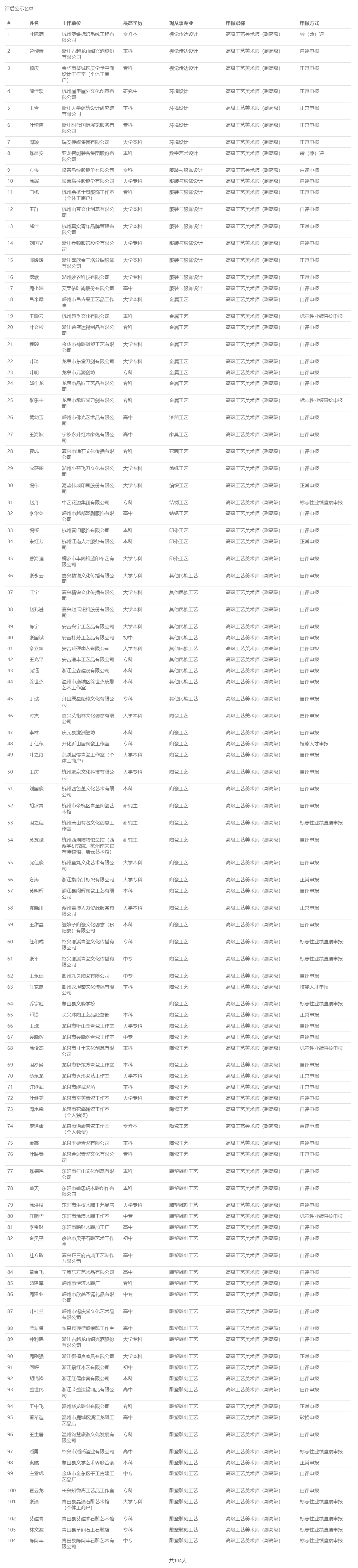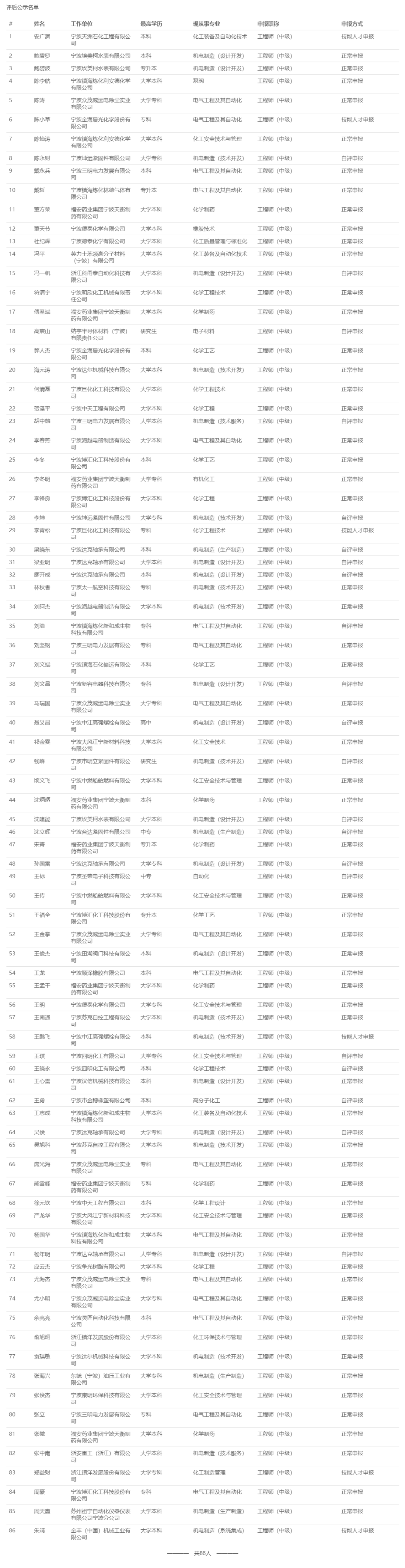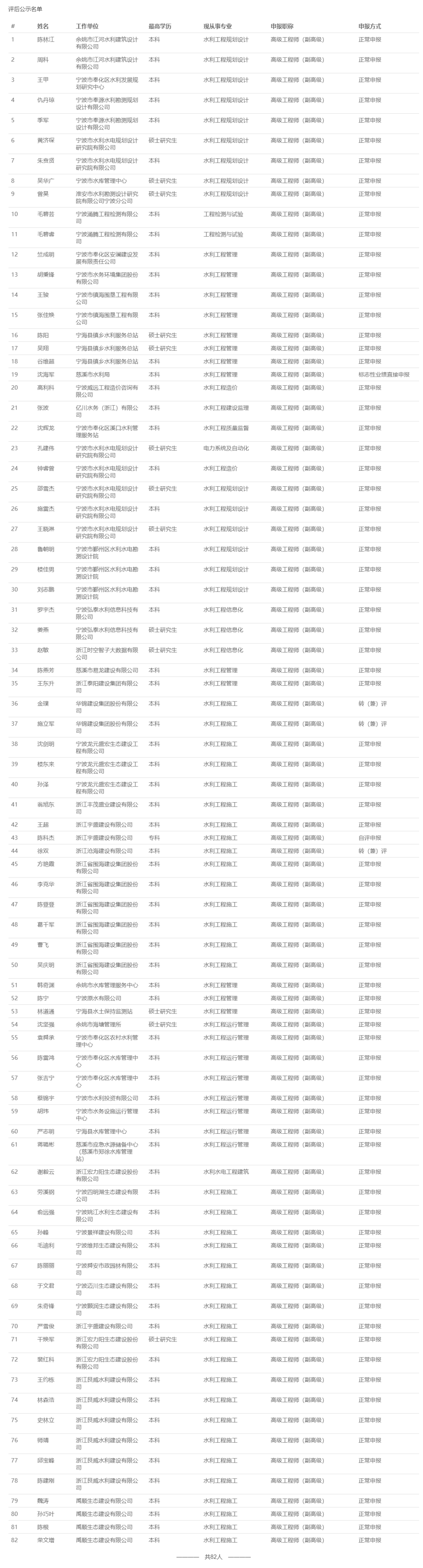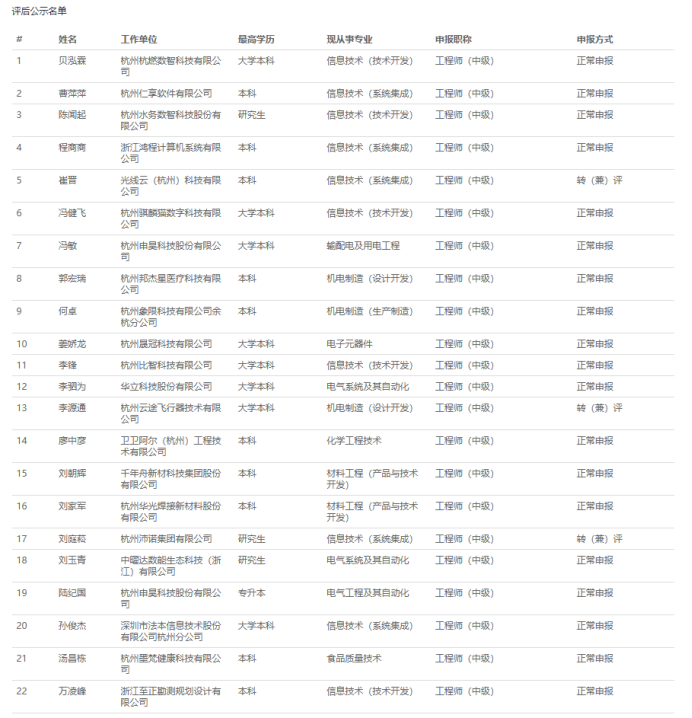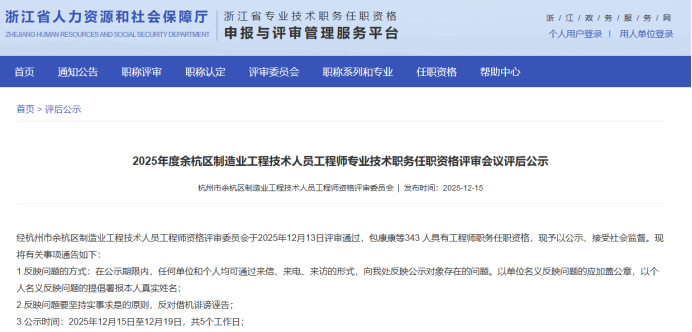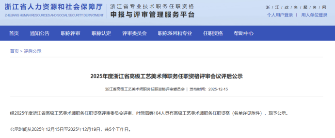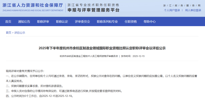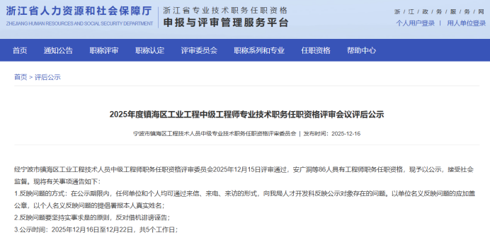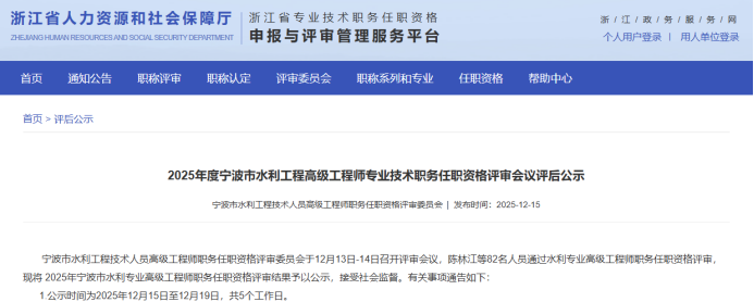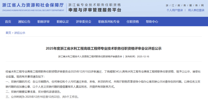 【评审结果】25年度省水利高级、高级工艺美术师,余杭区制造业中级,宁波市水利高级,镇海工业工程中级评审结果发布!发表时间:2025-12-16 16:07 01 25年度浙江省水利高级评审结果发布 12月16日,浙江省水利工程技术人员高级工程师职务任职资格评审委员会发布《2025年度浙江省水利工程高级工程师专业技术职务任职资格评审会议评后公示》,经省水利工程专业高级工程师职务任职资格评审委员会2025年12月15日评审通过,丁扬威等343人具有水利工程专业高级工程师职务任职资格,现予以公示,接受社会监督。 ![]() 公示时间 公示时间为 2025年12月16日至12月22日,共5个工作日。 人员名单 ![]() 02 25年度浙江省高级工艺美术师评审结果发布 12月15日,浙江省高级工艺美术师职务任职资格评审委员会发布《2025年度浙江省高级工艺美术师职务任职资格评审会议评后公示》,经2025年度浙江省高级工艺美术师职务任职资格评审委员会评审,叶际满等104人具有高级工艺美术师职务任职资格,现予公示。 ![]() 公示时间 公示时间从2025年12月15日至2025年12月19日,共5个工作日。 人员名单 ![]() 03 25年度余杭区制造业中级评审结果发布 12月15日,杭州市余杭区制造业工程技术人员工程师资格评审委员会发布《2025年度余杭区制造业工程技术人员工程师专业技术职务任职资格评审会议评后公示》,经杭州市余杭区制造业工程技术人员工程师资格评审委员会于2025年12月13日评审通过,包康康等343 人具有工程师职务任职资格,现予以公示,接受社会监督。 ![]() 公示时间 2025年12月15日至12月19日,共5个工作日。 人员名单 ![]() 04 25年下半年度余杭区制造业国际比照认定评审结果发布 12月15日,杭州市余杭区制造业工程技术人员工程师资格评审委员会发布《2025年下半年度杭州市余杭区制造业领域国际职业资格比照认定职称评审会议评后公示》,本次共有38人进入评后公示,现予以公示,接受社会监督。 ![]() 公示时间 2025年12月15日至12月19日,共5个工作日。 人员名单 ![]() ![]() 05 25年度宁波市水利工程高级评审结果发布 12月15日,宁波市水利工程技术人员高级工程师职务任职资格评审委员会发布《2025年度宁波市水利工程高级工程师专业技术职务任职资格评审会议评后公示》,宁波市水利工程技术人员高级工程师职务任职资格评审委员会于12月13日-14日召开评审会议,陈林江等82名人员通过水利专业高级工程师职务任职资格评审,现将 2025年宁波市水利专业高级工程师职务任职资格评审结果予以公示,接受社会监督。 ![]() 公示时间 公示时间为2025年12月15日至12月19日,共5个工作日。 人员名单 ![]() 06 25年度镇海区工业工程中级评审结果发布 12月16日,宁波市镇海区工程技术人员中级专业技术职务任职资格评审委员会发布《2025年度镇海区工业工程中级工程师专业技术职务任职资格评审会议评后公示》,经宁波市镇海区工业工程技术人员中级工程师职务任职资格评审委员会2025年12月15日评审通过,安广洞等86人具有工程师职务任职资格,现予以公示,接受社会监督。 ![]() 公示时间 2025年12月16日至12月22日,共5个工作日。 人员名单 ![]() |