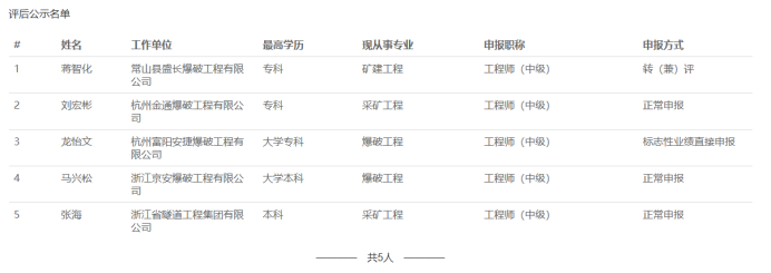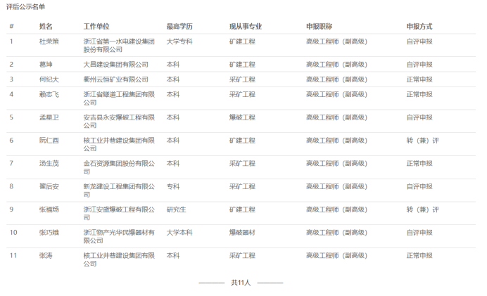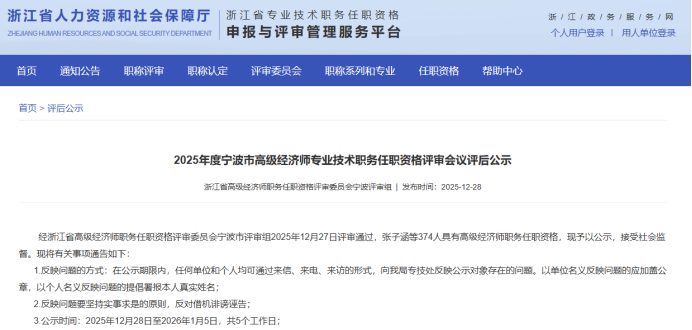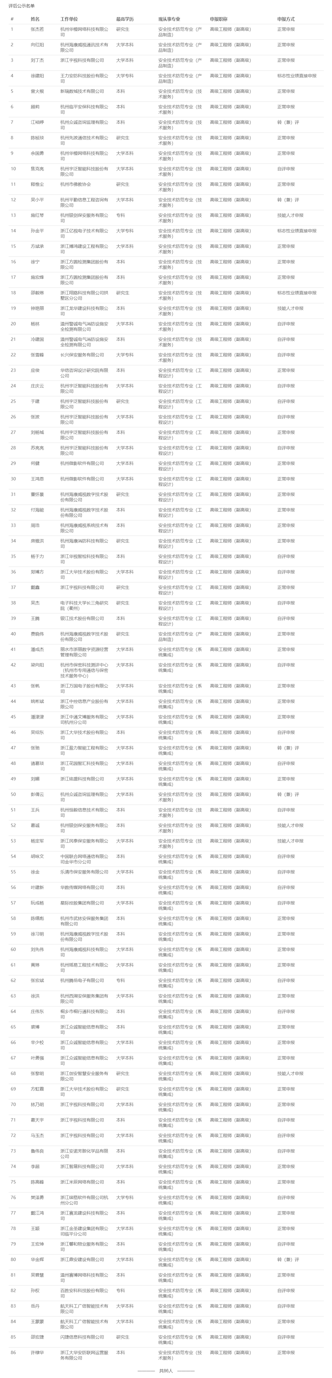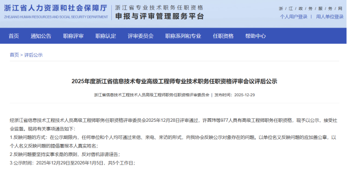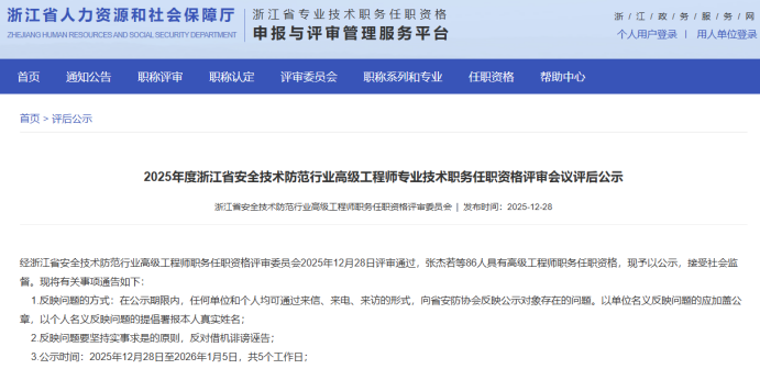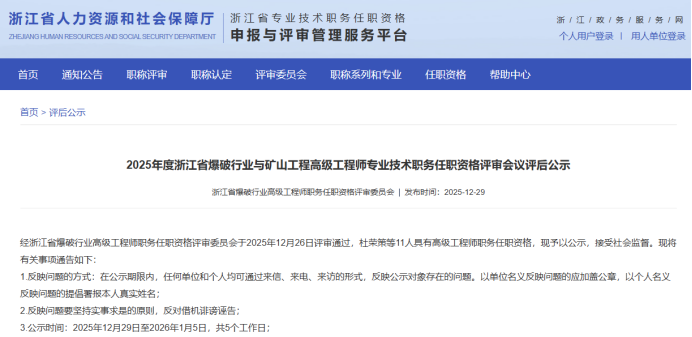 【评审结果】25年度浙江省信息技术高级,宁波高级经济师,省爆破安防高级结果发布!发表时间:2025-12-29 16:07 01 25年度浙江省信息技术高级评审结果发布 12月29日,浙江省信息技术工程技术人员高级工程师职务任职资格评审委员会发布《2025年度浙江省信息技术专业高级工程师专业技术职务任职资格评审会议评后公示》,经浙江省信息技术工程技术人员高级工程师职务任职资格评审委员会2025年12月28日评审通过,许茜玮等977人具有高级工程师职务任职资格,现予以公示,接受社会监督。 ![]() 公示时间 2025年12月29日至2026年1月5日,共5个工作日; 人员名单 25年度浙江省信息技术高级职称评后公示名单.xlsx 02 25年度宁波市高级经济师评审结果发布 12月28日,浙江省高级经济师职务任职资格评审委员会宁波评审组发布《2025年度宁波市高级经济师专业技术职务任职资格评审会议评后公示》,经浙江省高级经济师职务任职资格评审委员会宁波市评审组2025年12月27日评审通过,张子涵等374人具有高级经济师职务任职资格,现予以公示,接受社会监督。 ![]() 公示时间 2025年12月28日至2026年1月5日,共5个工作日; 人员名单 25年度宁波市高级经济师评后公示名单.xlsx 03 25年度浙江省爆破行业与矿山工程高级评审结果发布 12月29日,浙江省爆破行业高级工程师职务任职资格评审委员会发布《2025年度浙江省爆破行业与矿山工程高级工程师专业技术职务任职资格评审会议评后公示》,经浙江省爆破行业高级工程师职务任职资格评审委员会于2025年12月26日评审通过,杜荣策等11人具有高级工程师职务任职资格,现予以公示,接受社会监督。 ![]() 公示时间 2025年12月29日至2026年1月5日,共5个工作日; 人员名单 ![]() 04 25年度浙江省爆破行业与矿山工程中级评审结果发布 12月29日,浙江省爆破行业工程师职务任职资格评审委员会发布《2025年度浙江省爆破行业与矿山工程工程师专业技术职务任职资格评审会议评后公示》,经浙江省爆破行业工程师职务任职资格评审委员会于2025年12月26日评审通过,蒋智化等5人具有工程师职务任职资格,现予以公示,接受社会监督。 ![]() 公示时间 2025年12月29日至2026年1月5日,共5个工作日; 人员名单 ![]() 05 25年度浙江省安全技术防范高级评审结果发布 12月28日,浙江省安全技术防范行业高级工程师职务任职资格评审委员会发布《2025年度浙江省安全技术防范行业高级工程师专业技术职务任职资格评审会议评后公示》,经浙江省安全技术防范行业高级工程师职务任职资格评审委员会2025年12月28日评审通过,张杰若等86人具有高级工程师职务任职资格,现予以公示,接受社会监督。 ![]() 公示时间 2025年12月28日至2026年1月5日,共5个工作日; 人员名单 ![]() |