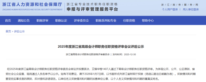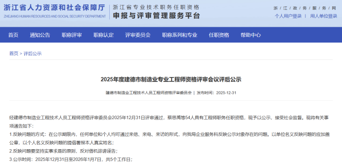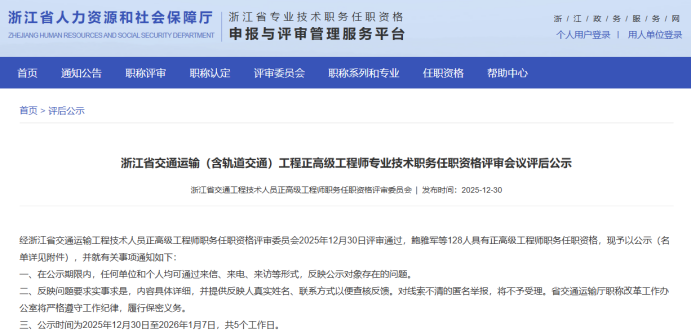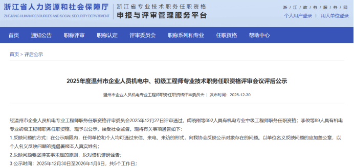 【评审结果】25年度浙江省交通正高级、高级会计师,建德市机电中级,温州机电中初级评审结果发布!发表时间:2025-12-31 16:11 01 25年度浙江省交通正高级评审结果发布 12月30日,浙江省交通工程技术人员正高级工程师职务任职资格评审委员会发布《浙江省交通运输(含轨道交通)工程正高级工程师专业技术职务任职资格评审会议评后公示》,经浙江省交通运输工程技术人员正高级工程师职务任职资格评审委员会2025年12月30日评审通过,鲍雅军等128人具有正高级工程师职务任职资格。 ![]() 公示时间 公示时间为2025年12月30日至2026年1月7日,共5个工作日。 人员名单 ![]() 02 25年度浙江省高级会计师评审结果发布 12月30日,浙江省高级会计师职务任职资格评审委员会发布《2025年度浙江省高级会计师职务任职资格评审会议评后公示》,经2025年度浙江省高级会计师职务任职资格评审委员会审议并投票表决,艾锋华等1407人通过了高级会计师职务任职资格评审。为体现公开、公平、公正原则,接受社会公众监督,现将通过人员名单予以公示。 ![]() 公示时间 公示时间为2025年12月30日至2026年1月7日,共5个工作日。 人员名单 25年度浙江省高级会计师评后公示名单.xlsx 03 25年度建德市制造业中级评审结果发布 12月31日,建德市制造业工程技术人员工程师资格评审委员会发布《2025年度建德市制造业专业工程师资格评审会议评后公示》,经建德市制造业工程技术人员工程师资格评审委员会2025年12月31日评审通过,蔡思禹等54人具有工程师职务任职资格,现予以公示,接受社会监督。 ![]() 公示时间 2025年12月31日至2026年1月7日,共5个工作日; 人员名单 ![]() 04 25年度温州市机电中初级评审结果发布 12月30日,温州市企业人员机电专业工程师职务任职资格评审委员会发布《2025年度温州市企业人员机电中、初级工程师专业技术职务任职资格评审会议评后公示》,经温州市企业人员机电专业工程师职务任职资格评审委员会2025年12月27日评审通过,闫晓刚等692人具有机电专业中级工程师职务任职资格;李俊等89人具有机电专业初级工程师职务任职资格,现予以公示,接受社会监督。 ![]() 公示时间 2025年12月30日至2026年1月6日,共5个工作日; 人员名单 25年度温州市机电中初级评后公示名单.xlsx |
