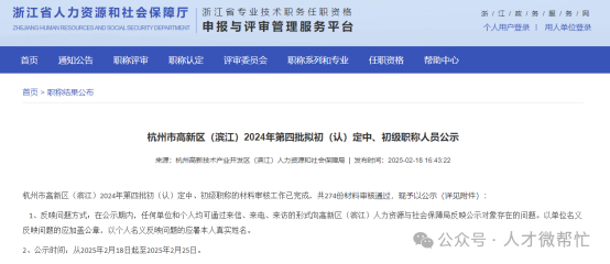 杭州市高新区(滨江)24年度第四批初定认定中初级人员公示发布!