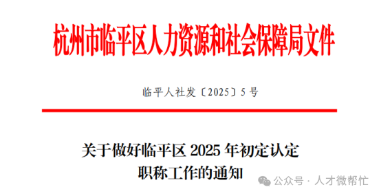 2月19日,杭州市临平区人力资源和社会保障局发布《关于做好临平区2025年初定认定职称工作的通知》,对25年度临平区职称初定认定工作作出相关规定安排。