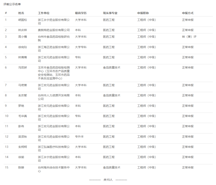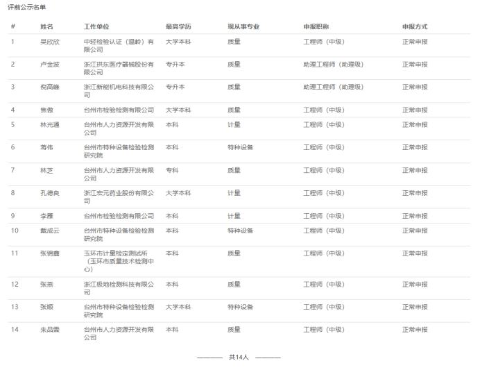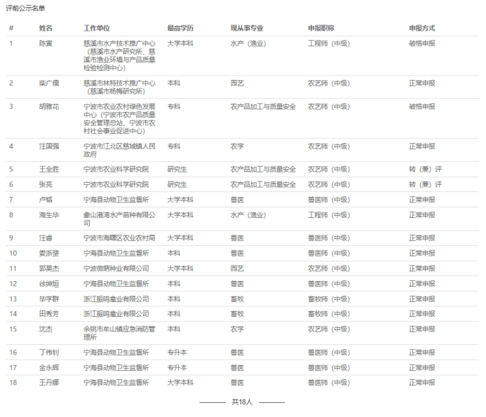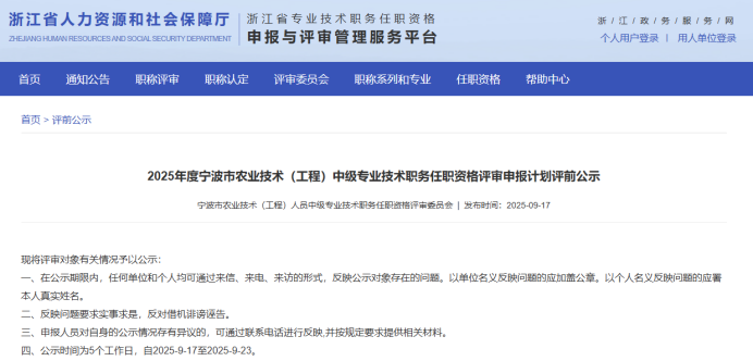 【评前公示】25年度宁波市农业中级、台州质量、医药中级评前公示发布!发表时间:2025-09-17 15:42 01 25年度宁波市农业技术(工程)中级评前公示发布 9月17日,宁波市农业技术(工程)人员中级专业技术职务任职资格评审委员会发布《2025年度宁波市农业技术(工程)中级专业技术职务任职资格评审申报计划评前公示》,本次共有18人进入评前公示,顺利通过公示期后,就将送至专家评委会进行专业评审。 ![]() 公示时间 公示时间为5个工作日,自2025-9-17至2025-9-23 人员名单 ![]() 02 25年度台州市质量技术基础中级评前公示发布 9月17日,台州市质量技术基础中级专业技术资格评审委员会发布《2025年度台州市质量技术基础专业中级专业技术职务任职资格评审计划评前公示》,本次共有14人进入评前公示,顺利通过公示期后,就将送至专家评委会进行专业评审。 ![]() 公示时间 公示时间为5个工作日,自2025-09-17至2025-09-23。 人员名单 ![]() 03 25年度台州市医药行业中级评前公示发布 9月17日,台州市医药行业中级专业技术资格评审委员会发布《2025年度台州市医药行业中级专业技术职务任职资格评审计划评前公示》,本次共有15人进入评前公示,顺利通过公示期后,就将送至专家评委会进行专业评审。 ![]() 公示时间 公示时间为5个工作日,自2025-09-17至2025-09-23。 人员名单 ![]() |