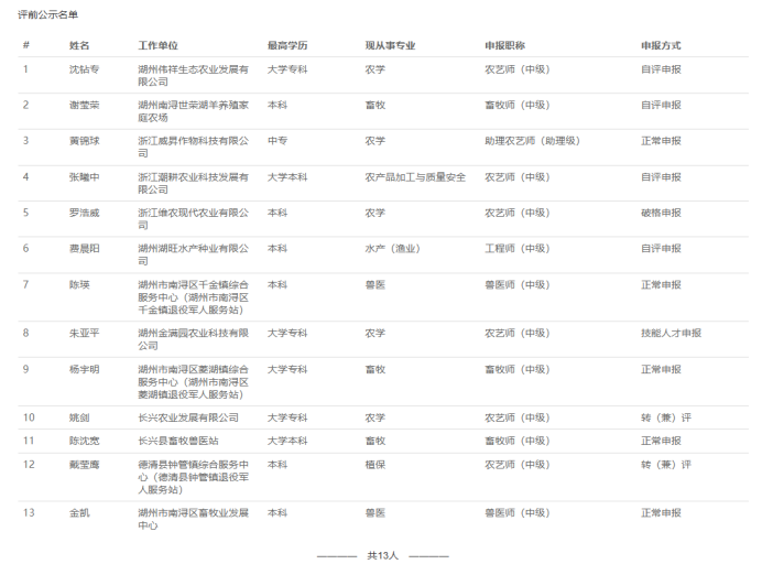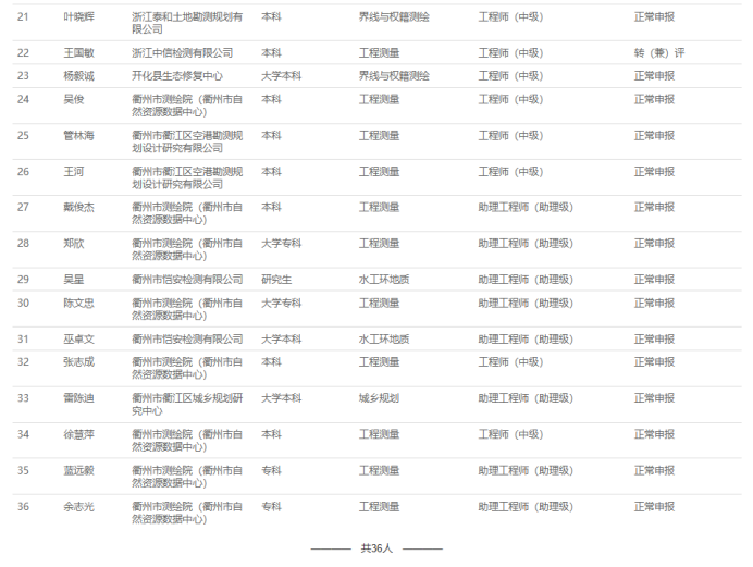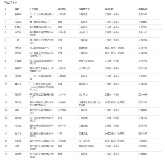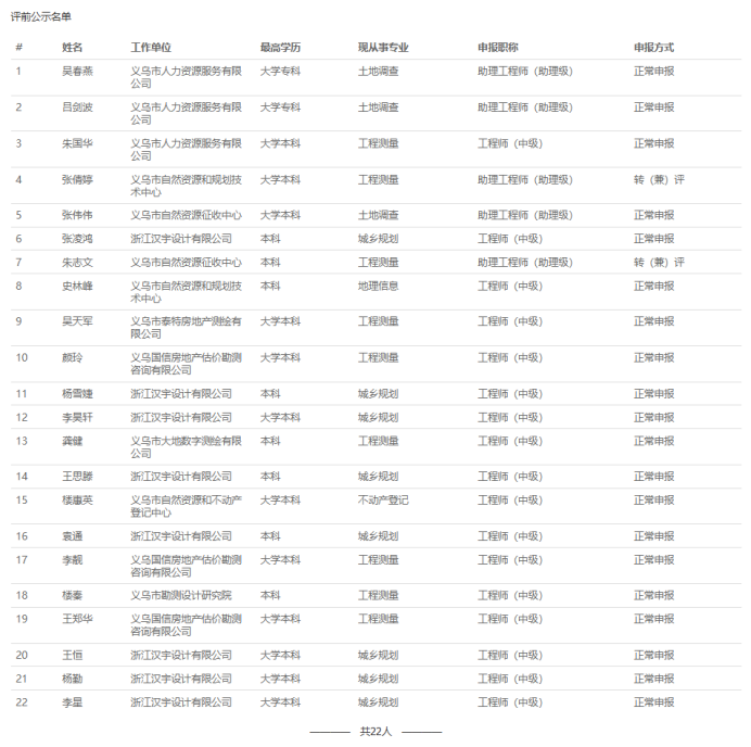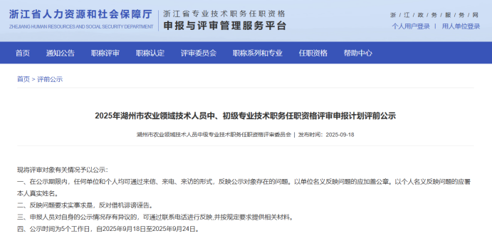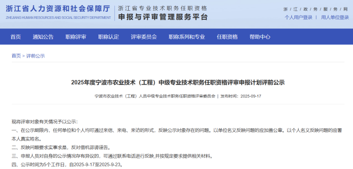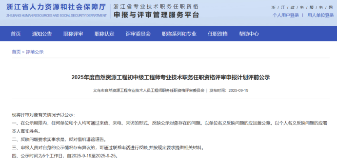 【评前公示】25年度宁波市农业中级、湖州农业中级、衢州自然资源中级、义乌市自然资源中级评前公示发布!发表时间:2025-09-19 16:20 01 25年度宁波市农业中级评前公示 9月17日,宁波农业技术(工程)人员中级专业技术职务任职资格评审委员会发布《2025年度宁波市农业技术(工程)中级专业技术职务任职资格评审申报计划评前公示》,本次共有18人进入评前公示,顺利通过公示期后,就将送至专家评委会进行专业评审。 ![]() 公示时间 公示时间为5个工作日,自2025-9-17至2025-9-23 人员名单 ![]() 02 25年度湖州农业中初级评前公示发布 9月18日,湖州市农业领域技术人员中级专业技术职务任职资格评审委员会发布《2025年度湖州市农业领域技术人员中、初级专业技术职务任职资格评审申报计划评前公示,本次共有13人进入评前公示,顺利通过公示期后,就将送至专家评委会进行专业评审。 ![]() 公示时间 公示时间为5个工作日,自2025年9月18日至2025年9月24日。 人员名单 ![]() 03 25年度衢州自然资源中级评前公示发布 9月19日,衢州市自然资源工程领域工程师职务任职资格评审委员会发布《2025年度衢州市自然资源领域工程师专业技术职务任职资格评审申报计划评前公示》,本次共有36人进入评前公示,顺利通过公示期后,就将送至专家评委会进行专业评审。 ![]() 公示时间 公示时间为5个工作日,自2025-9-19至2025-9-25 人员名单 ![]() ![]() 04 25年度义乌市自然资源工程中级评前公示发布 9月19日,义乌市自然资源工程专业技术人员工程师职务任职资格评审委员会发布《2025年度自然资源工程初中级工程师专业技术职务任职资格评审申报计划评前公示》,本次共有22人进入评前公示,顺利通过公示期后,就将送至专家评委会进行专业评审。 ![]() 公示时间 公示时间为5个工作日,自2025-9-19至2025-9-25 人员名单 ![]() |