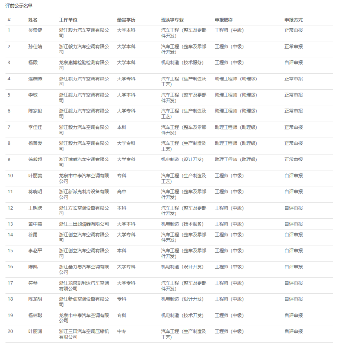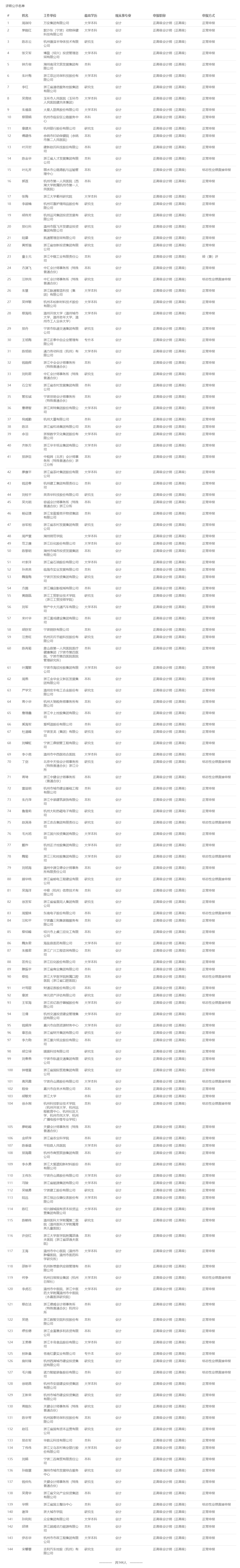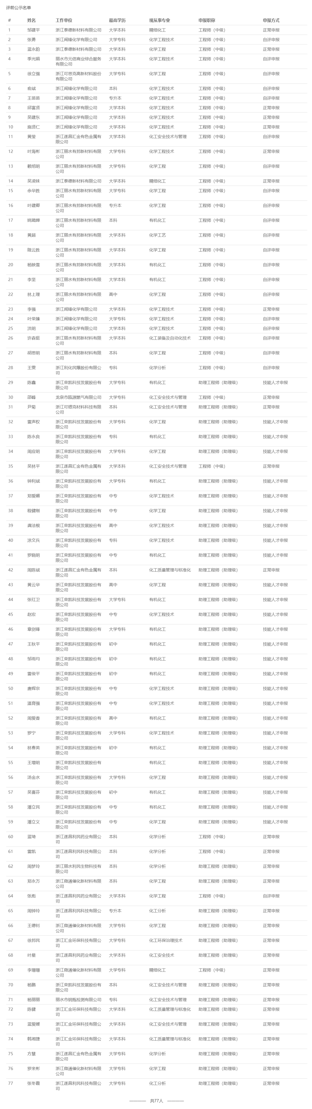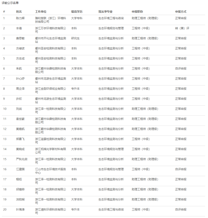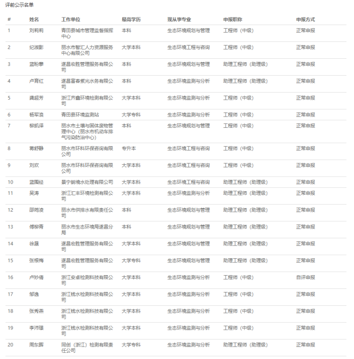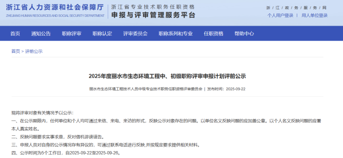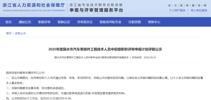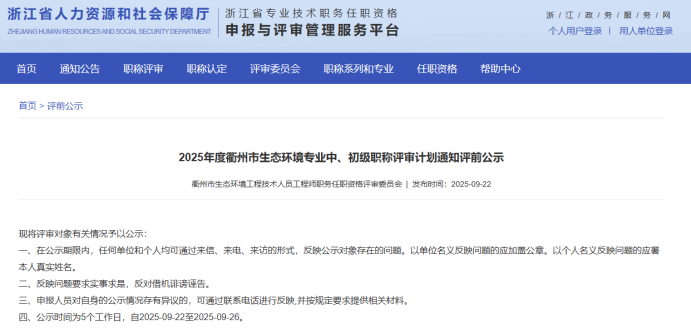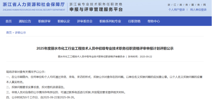 【评前公示】25年度浙江省正高会计师,衢州生态环境中初级,丽水生态环境、化工、汽车零部件中初级评前公示发布!发表时间:2025-09-23 17:03 01 25年度浙江省正高级会计师评前公示发布 9月23日,浙江省正高级会计师职务任职资格评审委员会发布《2025年度浙江省正高级会计师职务任职资格评审申报计划评前公示》,经审查,144名均符合申报条件,拟提交浙江省正高级会计师职务任职资格评审委员会评审。 ![]() 公示时间 2025年9月23日至9月29日 人员名单 ![]() 02 25年度衢州市生态环境中初级评前公示发布 9月22日,衢州市生态环境工程技术人员工程师职务任职资格评审委员会发布《2025年度衢州市生态环境专业中、初级职称评审计划通知评前公示》,本次共有30人进入评前公示,顺利通过公示期后就将送至专家评委会进行专业评审。 ![]() 公示时间 公示时间为5个工作日,自2025-09-22至2025-09-26 人员名单 ![]() ![]() 03 25年度丽水市生态环境中初级评前公示发布 9月22日,丽水市生态环境工程技术人员工程师职务任职资格评审委员会发布《2025年度丽水市生态环境专业中、初级职称评审计划通知评前公示》,本次共有37人进入评前公示,顺利通过公示期后就将送至专家评委会进行专业评审。 ![]() 公示时间 公示时间为5个工作日,自2025-09-22至2025-09-26 人员名单 ![]() ![]() 04 25年度丽水市化工中初级评前公示发布 9月22日,丽水市化工工程技术人员工程师职务任职资格评审委员会发布《2025年度丽水市化工工程专业中、初级职称评审计划通知评前公示》,本次共有77人进入评前公示,顺利通过公示期后就将送至专家评委会进行专业评审。 ![]() 公示时间 公示时间为5个工作日,自2025-09-22至2025-09-26。 人员名单 ![]() 05 25年度丽水市汽车零部件中初级评前公示发布 9月22日,丽水市汽车零部件工程技术人员工程师职务任职资格评审委员会发布《2025年度丽水市汽车零部件工程专业中、初级职称评审计划通知评前公示》,本次共有49人进入评前公示,顺利通过公示期后就将送至专家评委会进行专业评审。 ![]() 公示时间 公示时间为5个工作日,自2025-09-22至2025-09-26。 人员名单 ![]() ![]() ![]() |