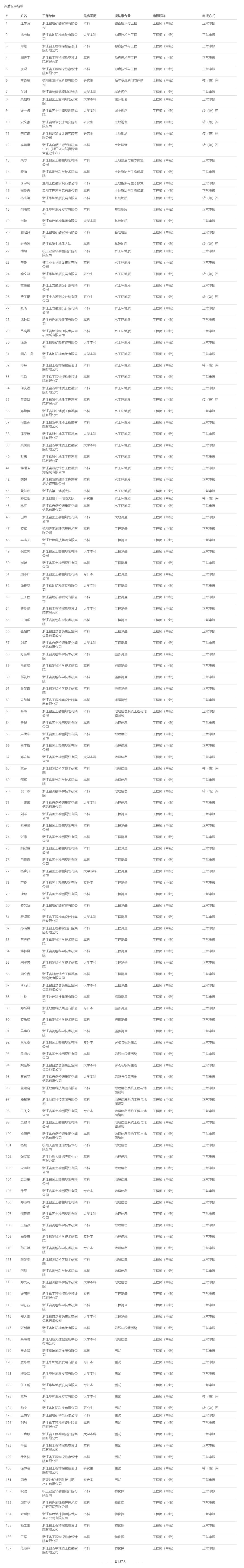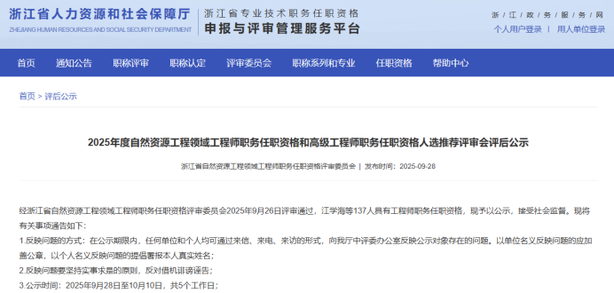 04 25年度省自然资源领域中级评审结果发布 9月28日,浙江省自然资源工程领域工程师职务任职资格评审委员会发布《2025年度自然资源工程领域工程师职务任职资格和高级工程师职务任职资格人选推荐评审会议评后公示》,经浙江省自然资源工程领域工程师职务任职资格评审委员会2025年9月26日评审通过,江学海等137人具有工程师职务任职资格,现予以公示。 ![]() 公示时间 2025年9月28日至10月10日,共5个工作日 人员名单 ![]() |