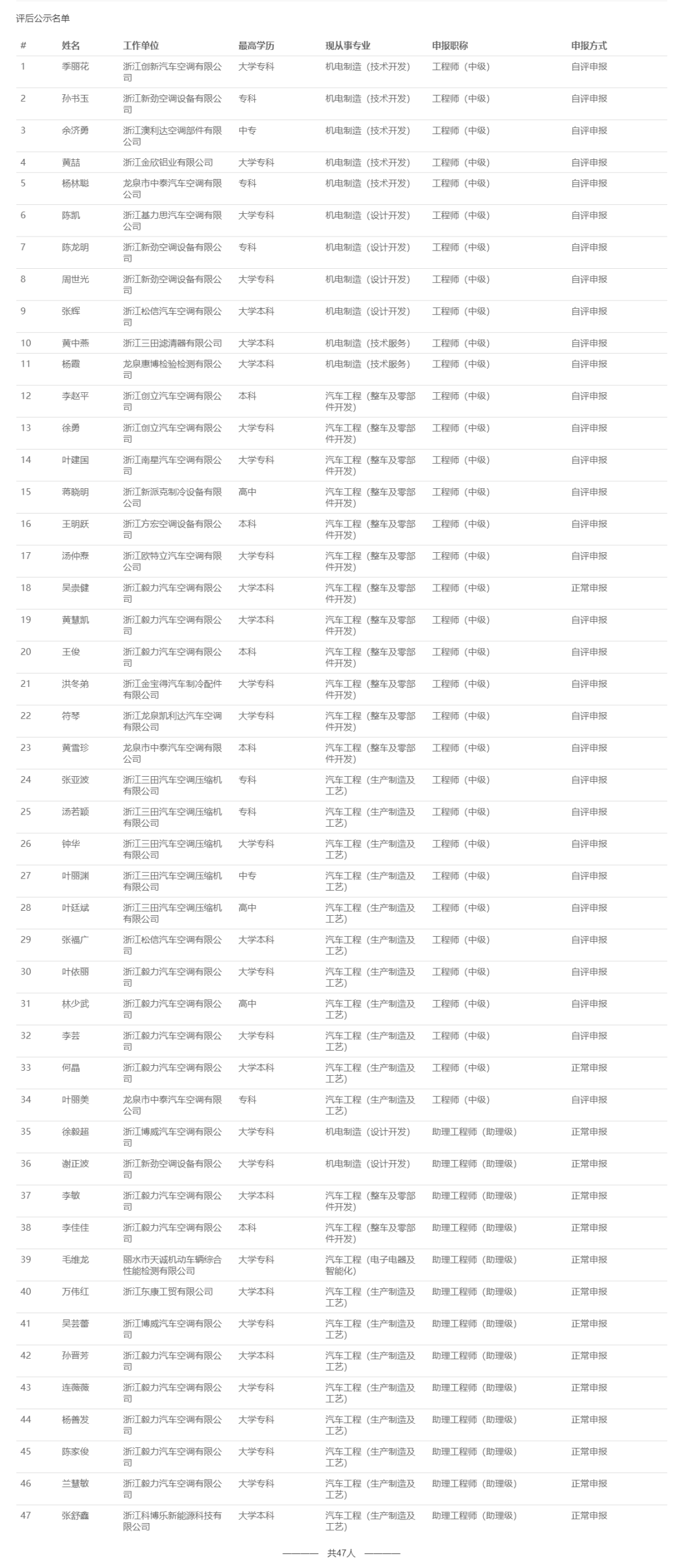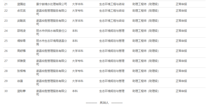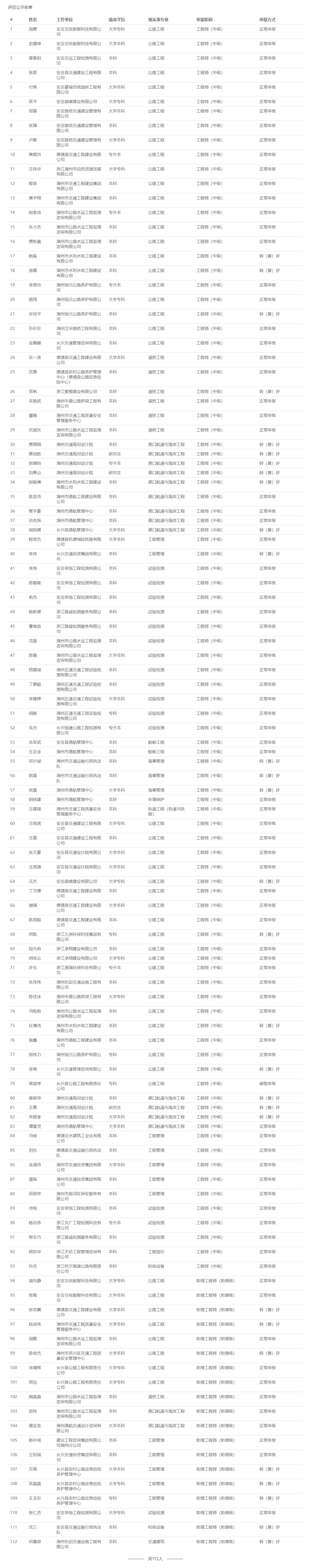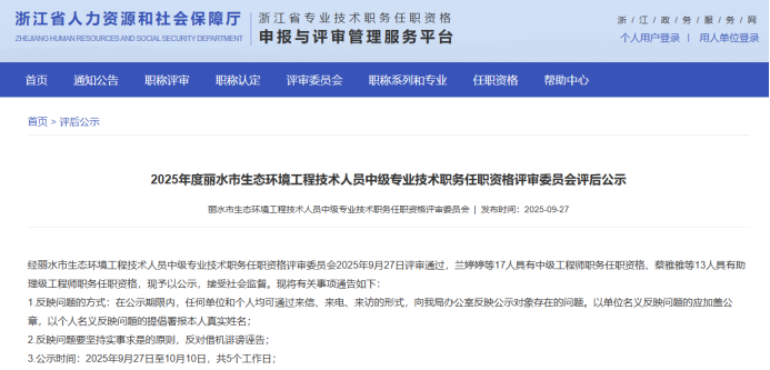 【评审结果】25年度省自然资源中级,丽水市生态环境中级、汽车零部件中级,湖州交通中级评审结果发布!发表时间:2025-09-28 16:34 01 25年度丽水市生态环境工程中级评审结果发布 9月27日,丽水市生态环境工程技术人员中级专业技术职务任职资格评审委员会发布《2025年度丽水市生态环境工程技术人员中级专业技术职务任职资格评审委员会评后公示》,经丽水市生态环境工程技术人员中级专业技术职务任职资格评审委员会2025年9月27日评审通过,兰婷婷等17人具有中级工程师职务任职资格、蔡雅雅等13人具有助理级工程师职务任职资格,现予以公示。 ![]() 公示时间 2025年9月27日至10月10日,共5个工作日 人员名单 ![]() ![]() 02 25年度湖州市交通运输中级评审结果发布 9月26日,湖州市交通工程技术人员工程师职务任职资格评审委员会发布《2025年度湖州市交通运输(含轨道交通)工程专业技术职务任职资格推荐评审会议评后公示》,经湖州市交通工程技术人员工程师职务任职资格评审委员会2025年9月24日评审通过,周勇等112人具相应专业技术职务任职资格 ,现予以公示。 ![]() 公示时间 公示时间为5个工作日,自2025年9月26日至2025年10月9日 人员名单 ![]() 03 25年度丽水市汽车零部件工程技术人员中级评审结果发布 9月28日,丽水市汽车零部件工程技术人员中级专业技术职务任职资格评审委员会发布《2025年度丽水市汽车零部件工程技术人员中级专业技术职务任职资格评审会议评后公示》,经丽水市汽车零部件工程技术人员中级专业技术职务任职资格评审委员会2025年9月28日评审通过,季丽花等34人具有工程师职务任职资格,徐毅超等13人具有助理工程师职务任职资格,现予以公示。 ![]() 公示时间 2025年9月28日至10月10日,共5个工作日 人员名单