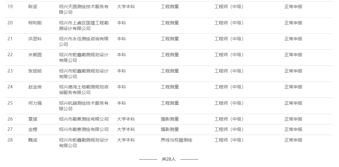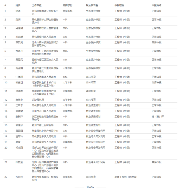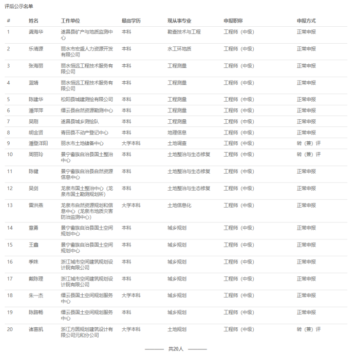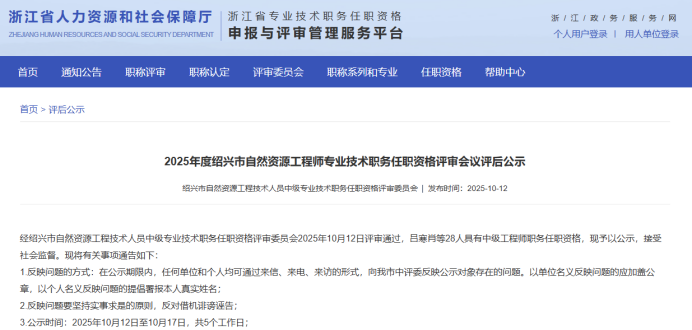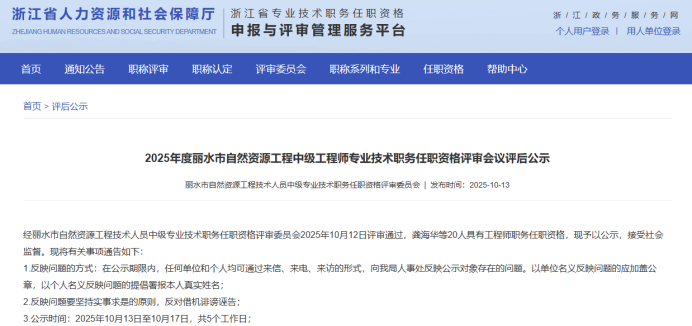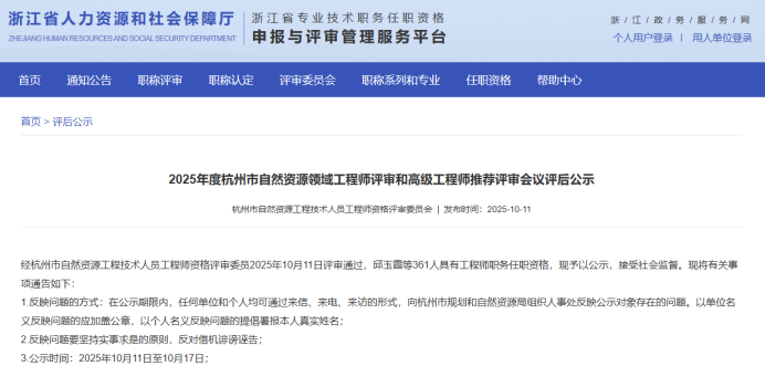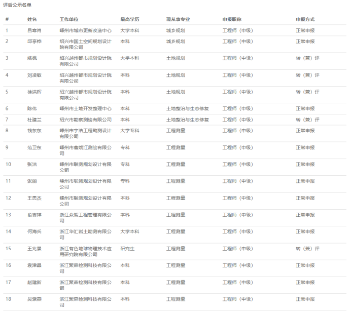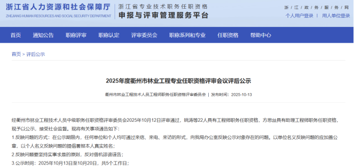 【评审结果】25年度杭州市自然资源中级、绍兴市自然资源中级、衢州林业中级、丽水自然资源中级评审结果发布!发表时间:2025-10-13 16:32 01 25年度杭州市自然资源工程中级评审结果发布 10月11日,杭州市自然资源工程技术人员工程师资格评审委员会发布《2025年度杭州市自然资源领域工程师评审和高级工程师推荐评审会议评后公示》,经杭州市自然资源工程技术人员工程师资格评审委员2025年10月11日评审通过,邱玉霞等361人具有工程师职务任职资格,现予以公示。 ![]() 公示时间 2025年10月11日至10月17日; 人员名单 ![]() 02 25年度衢州市林业中级评审结果发布 10月13日,衢州市林业工程技术人员工程师职务资格评审委员会发布《2025年度衢州市林业工程专业任职资格评审会议评后公示》,经衢州市林业工程技术人员中级职务任职资格评审委员会2025年10月12日评审通过,姚涛等22人具有工程师职务任职资格,方思丝具有助理工程师职务任职资格,现予以公示。 ![]() 公示时间 2025年10月13日至10月20日,共5个工作日 人员名单 ![]() 03 25年度丽水市自然资源工程中级评审结果发布 10月13日,丽水市自然资源工程技术人员中级专业技术职务任职资格评审委员会发布《2025年度丽水市自然资源工程中级工程师专业技术职务任职资格评审会议评后公示》,经丽水市自然资源工程技术人员中级专业技术职务任职资格评审委员会2025年10月12日评审通过,龚海华等20人具有工程师职务任职资格,现予以公示。 ![]() 公示时间 2025年10月13日至10月17日,共5个工作日 人员名单 ![]() 04 25年度绍兴市自然资源中级评审结果发布 10月12日,绍兴市自然资源工程技术人员中级专业技术职务任职资格评审委员会发布《2205年度绍兴市自然资源工程师专业技术职务任职资格评审会议评后公示》,经绍兴市自然资源工程技术人员中级专业技术职务任职资格评审委员会2025年10月12日评审通过,吕寒肖等28人具有中级工程师职务任职资格,现予以公示。 ![]() 公示时间 2025年10月12日至10月17日,共5个工作日; 人员名单 ![]() ![]() |