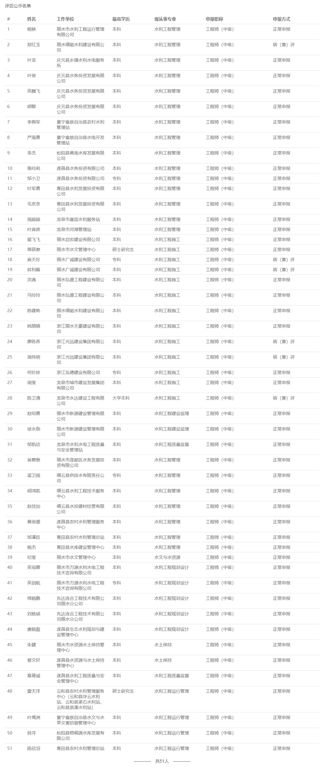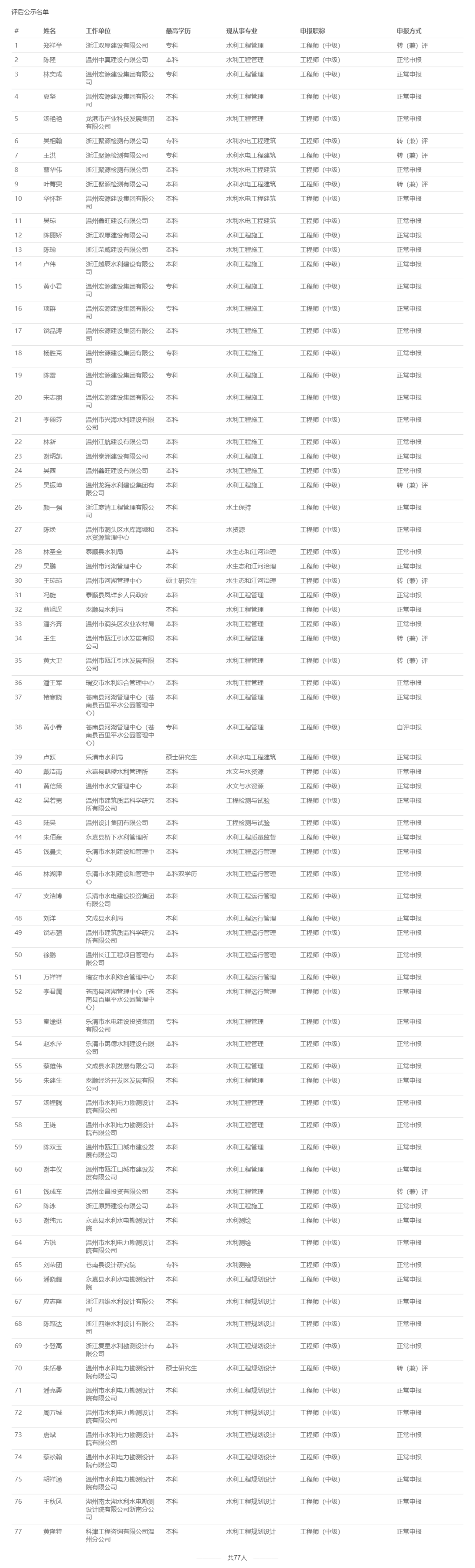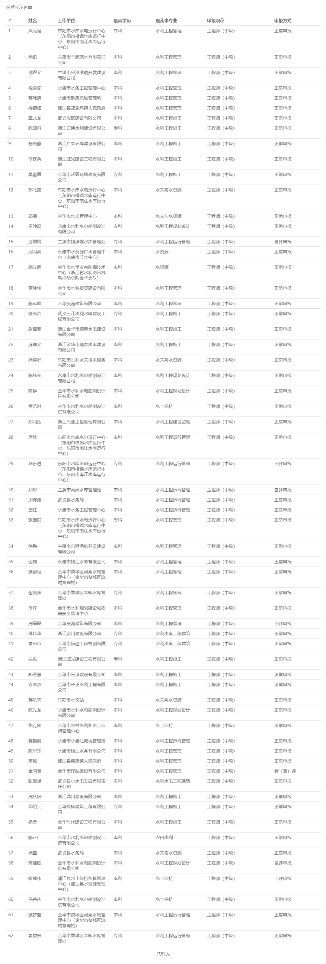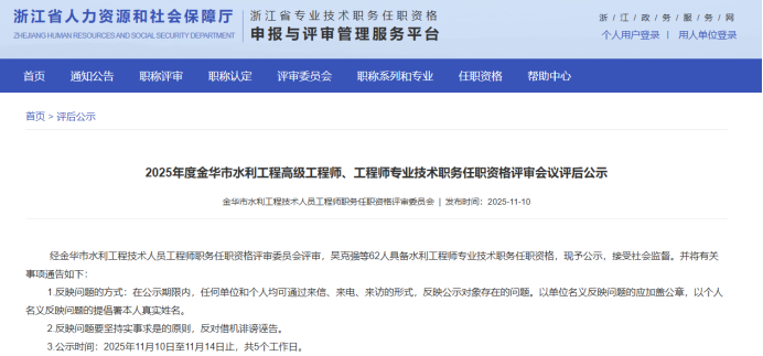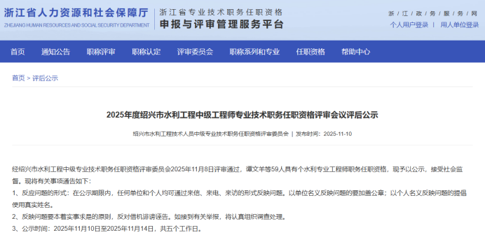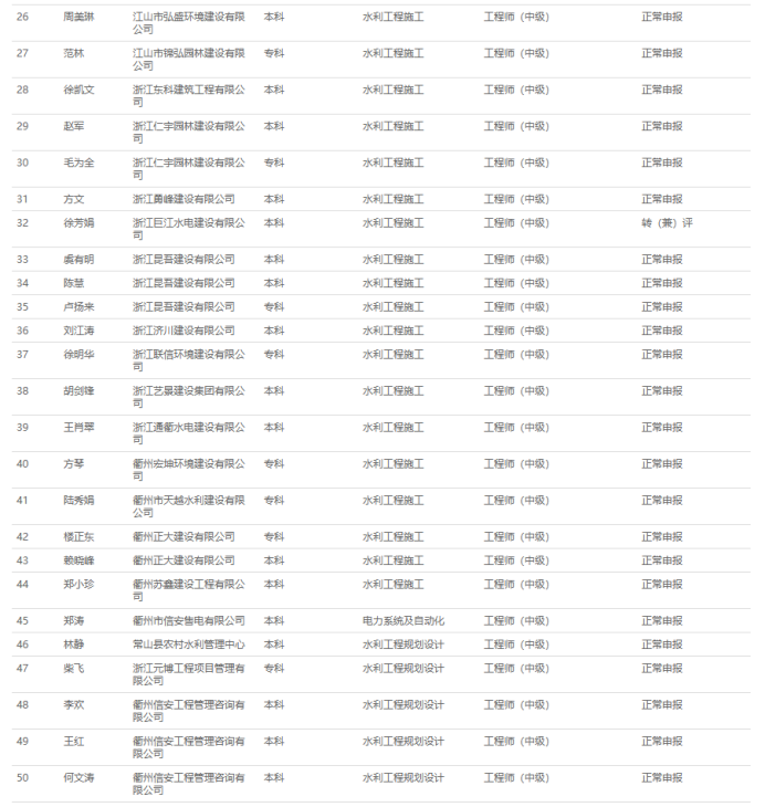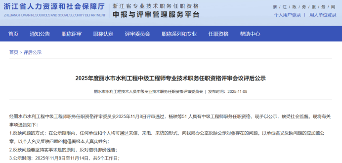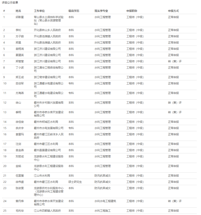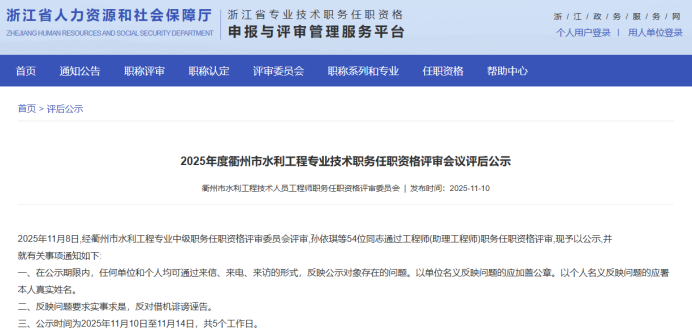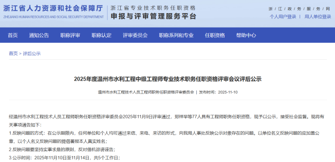 【评审结果】25年度金华市、丽水市、温州市、绍兴市、衢州市水利中级评审结果发布!发表时间:2025-11-10 16:08 01 25年度金华市水利中级评审结果发布 11月10日,金华市水利工程技术人员工程师职务任职资格评审委员会发布《2025年度金华市水利工程高级工程师、工程师专业技术职务任职资格评审会议评后公示》,经金华市水利工程技术人员工程师职务任职资格评审委员会评审,吴克强等62人具备水利工程师专业技术职务任职资格,现予公示,接受社会监督。 ![]() 公示时间 2025年11月10日至11月14日止,共5个工作日 人员名单 ![]() 02 25年度衢州市水利中级评审结果发布 11月10日,衢州市水利工程技术人员工程师职务任职资格评审委员会发布《2025年度衢州市水利工程专业技术职务任职资格评审会议评后公示》,2025年11月8日,经衢州市水利工程专业中级职务任职资格评审委员会评审,孙依琪等54位同志通过工程师(助理工程师)职务任职资格评审,现予以公示。 ![]() 公示时间 2025年11月10日至11月14日,共5个工作日 人员名单 ![]() ![]() ![]() 03 25年度温州水利中级评审结果发布 11月10日,温州市水利工程技术人员工程师职务任职资格评审委员会发布《2025年度温州市水利工程中级工程师专业技术职务任职资格评审会议评后公示》,经温州市水利工程技术人员工程师职务任职资格评审委员会2025年11月9日评审通过,郑祥举等77人具有工程师职务任职资格,现予以公示,接受社会监督。 ![]() 公示时间 2025年11月10日至11月14日,共5个工作日 人员名单 ![]() 04 25年度绍兴水利中级评审结果发布 11月10日,绍兴市水利工程技术人员中级专业技术职务任职资格评审委员会发布《2025年度绍兴市水利工程中级工程师专业技术职务任职资格评审会议评后公示》,经绍兴市水利工程中级专业技术职务任职资格评审委员会2025年11月8日评审通过,谭文羊等59人具有个水利专业工程师职务任职资格,现予以公示,接受社会监督。 ![]() 公示时间 2025年11月10日至2025年11月14日,共五个工作日 人员名单 ![]() 05 25年度丽水水利中级评审结果发布 11月10日,丽水市水利工程技术人员中级专业技术职务任职资格评审委员会发布《2025年度丽水市水利工程中级工程师专业技术职务任职资格评审会议评后公示》,经丽水市水利工程中级工程师职务任职资格评审委员会2025年11月8日评审通过,杨映等51 人具有中级工程师职务任职资格,现予以公示,接受社会监督。 ![]() 公示时间 2025年11月8日至11月14日,共5个工作日 人员名单 ![]() |