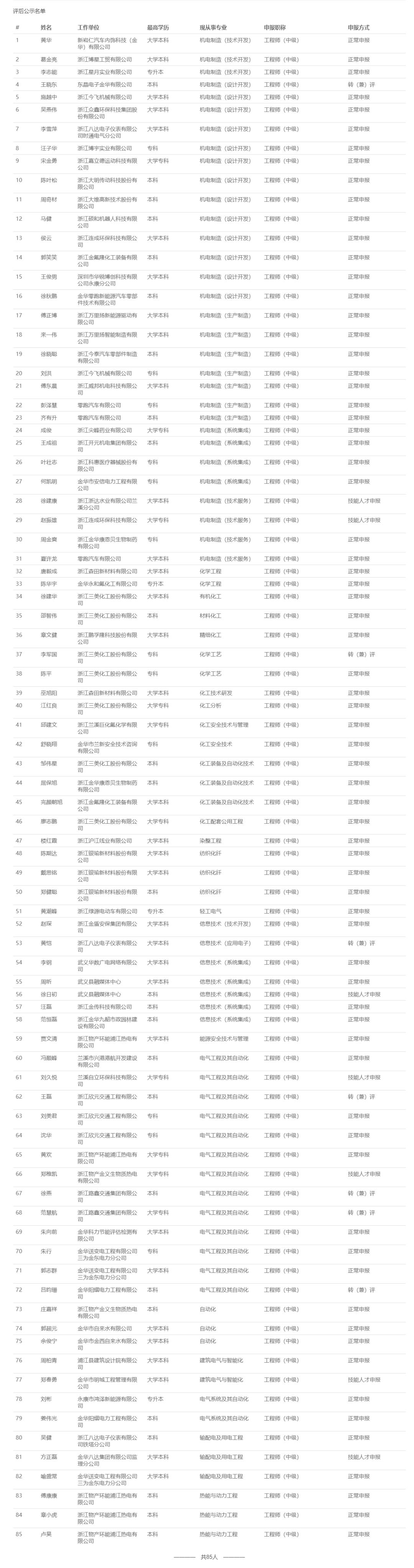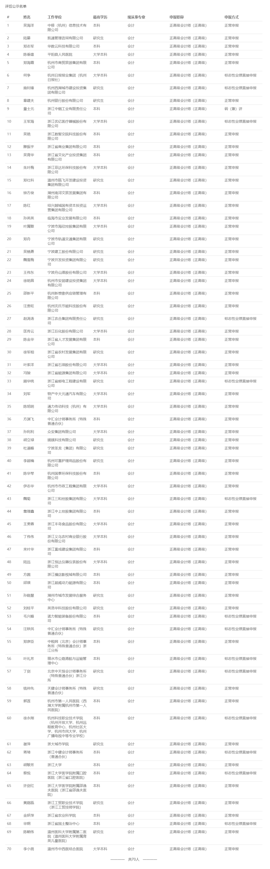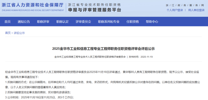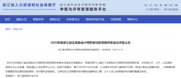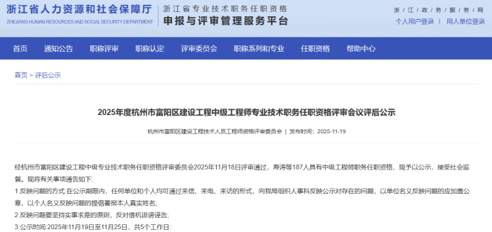 【评审结果】25年度浙江省正高级会计师、杭州市富阳区建筑中级、金华工业和信息工程中级评审结果发布!发表时间:2025-11-19 16:20 01 25年度浙江省正高级会计师评审结果发布 11月18日,浙江省正高级会计师职务任职资格评审委员会发布《2025年度浙江省正高级会计师职务任职资格评审会议评后公示》,经2025年度浙江省正高级会计师职务任职资格评审委员会审议并投票表决,吴海洋等70人通过了正高级会计师职务任职资格评审。 ![]() 公示时间 2025年11月25日前; 人员名单 ![]() 02 25年度杭州市富阳区建设工程中级评审结果发布 11月19日,杭州市富阳区建设工程技术人员工程师资格评审委员会发布《2025年度杭州市富阳区建设工程中级工程师专业技术职务任职资格评审会议评后公示》,经杭州市富阳区建设工程中级专业技术职务任职资格评审委员会2025年11月18日评审通过,寿涛等187人具有中级工程师职务任职资格,现予以公示,接受社会监督。 ![]() 公示时间 2025年11月19日至11月25日,共5个工作日; 人员名单 ![]() 03 25年度金华市工业和信息工程中级评审结果发布 11月19日,金华市工业和信息工程专业技术人员工程师职务任职资格评审委员会发布《2025年度金华市工业和信息工程专业工程师职务任职资格评审会议评后公示》,经金华市工业和信息工程专业技术人员工程师职务任职资格评审委员会2025年11月18日评审通过,黄华等85人具有工程师职务任职资格,现予以公示,接受社会监督。 ![]() 公示时间 2025年11月19日至11月25日,共5个工作日; 人员名单 ![]() |