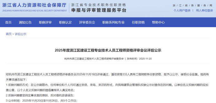 【评审结果】25年度杭州市滨江区建筑中级、金华市技能人才申报中级评审结果发布!发表时间:2025-11-20 16:23 01 25年度滨江区建设工程中级评审结果发布 11月20日,杭州市滨江区建设工程技术人员工程师资格评审委员会发布《2025年度滨江区建设工程专业技术人员工程师资格评审会议评后公示》,经杭州市滨江区建设工程技术人员工程师资格评审委员会2025年11月19日评审通过,潘佳波等333人具有工程师职务任职资格,现予以公示,接受社会监督。 ![]() 公示时间 2025年11月20日至11月26日,共5个工作日; 人员名单 ![]() 02 25年度金华企业技能人才中级评审结果发布 11月20日,金华市企业技能人才中级专业技术职务任职资格评审委员会发布《2025年度金华市企业技能人才中级专业技术职务任职资格评审会议评后公示》,经金华市企业技能人才中级专业技术职务评审委员会2025年11月19日评审通过,陈鹏光等10人具有中级工程师职务任职资格,现予以公示,接受社会监督。 ![]() 公示时间 2025年11月20日至11月26日,共5个工作日; 人员名单 ![]() |
