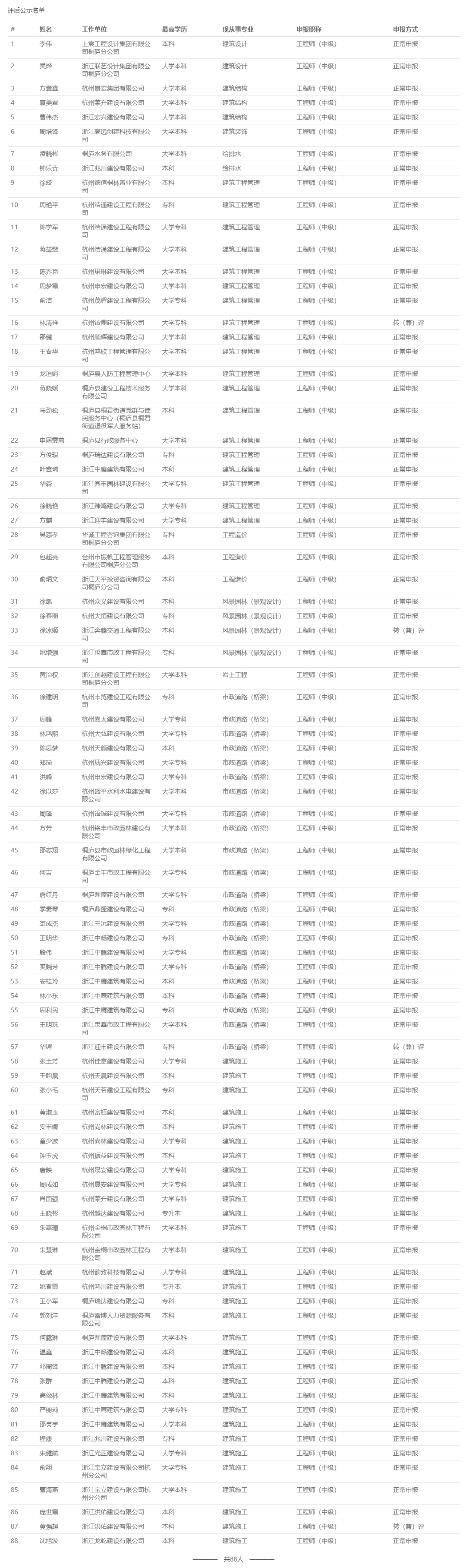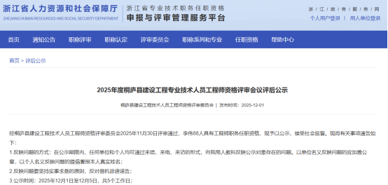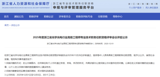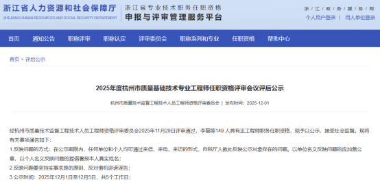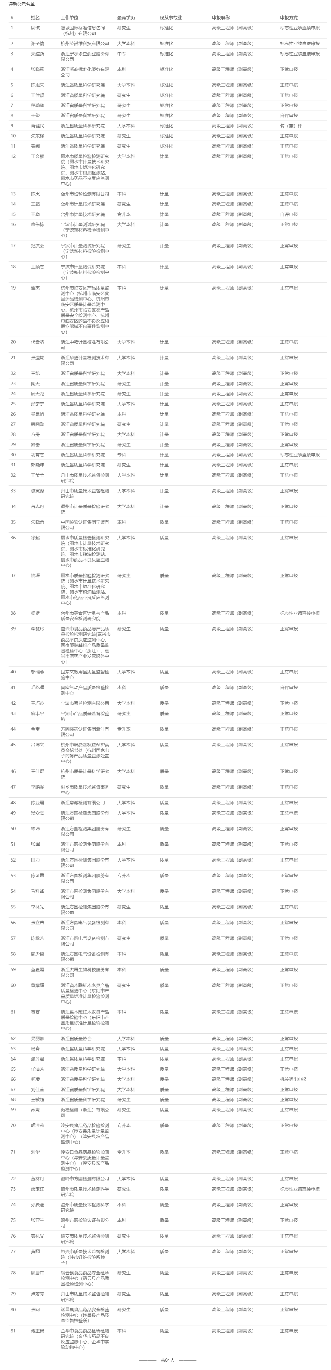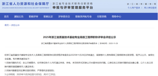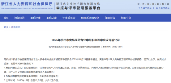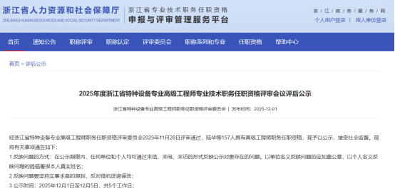 【评审结果】25年度浙江省质量、特种设备、光学光电高级,杭州市食品医药、质量、桐庐建筑中级评审结果发布!发表时间:2025-12-01 16:15 01 25年度浙江省质量技术高级评审结果发布 11月29日,浙江省质量技术基础专业技术人员高级工程师职务任职资格评审委员会发布《2025年浙江省质量技术基础专业高级工程师职称评审会评后公示》,经浙江省质量技术基础专业技术人员高级工程师职务任职资格评审委员会2025年11月29日评审通过,周琪等81人具有高级工程师职务任职资格,现予以公示,接受社会监督。 ![]() 公示时间 2025年11月29日至12月5日,共5个工作日; 人员名单 ![]() 02 25年度浙江省特种设备高级评审结果发布 12月1日,浙江省特种设备专业高级工程师职务任职资格评审委员会发布《2025年度浙江省特种设备专业高级工程师专业技术职务任职资格评审会议评后公示》,经浙江省特种设备专业高级工程师职务任职资格评审委员会2025年11月28日评审通过,陆华等157人具有高级工程师职务任职资格,现予以公示,接受社会监督。 ![]() 公示时间 2025年12月1日至12月5日,共5个工作日; 人员名单 ![]() 03 25年度浙江省光学光电评审结果发布 12月1日,浙江省光学光电行业高级工程师职务任职资格评审委员会发布《2025年度浙江省光学光电行业高级工程师专业技术职务任职资格评审会议评后公示》,经浙江省光学光电行业高级工程师专业技术职务任职资格评审委员会2025年11月29日评审通过,钱伟等45 人具有高级工程师职务任职资格,现予以公示,接受社会监督。 ![]() 公示时间 2025年12月1日至12月5日,共5个工作日; 人员名单 ![]() 04 25年度杭州市食品医药中级评审结果发布 12月1日,杭州市食品医药行业专业人员中级专业技术资格评审委员会发布《2025年杭州市食品医药专业中级职称评审会议评后公示》,经杭州市杭州市食品医药行业专业人员中级专业技术资格评审委员会2025年11月29日评审通过,黄黎华等127人具有工程师职务任职资格,现予以公示,接受社会监督。 ![]() 公示时间 2025年12月1日至12月5日,共5个工作日; 人员名单 ![]() 05 25年度杭州市质量中级评审结果发布 12月1日,杭州市质量技术监督工程技术人员工程师资格评审委员会发布《2025年度杭州市质量基础技术专业工程师任职资格评审会议评后公示》,经杭州市质量技术监督工程技术人员工程师资格评审委员会2025年11月29日评审通过,李磊等149 人具有工程师职务任职资格,现予以公示,接受社会监督。 ![]() 公示时间 2025年12月1日至12月5日,共5个工作日; 人员名单 ![]() 06 25年度桐庐县建筑中级评审结果发布 12月1日,桐庐县建设工程技术人员工程师资格评审委员会发布《2025年度桐庐县建设工程专业技术人员工程师资格评审会议评后公示》,经桐庐县建设工程技术人员工程师资格评审委员会2025年11月30日评审通过,李伟88人具有工程师职务任职资格,现予以公示,接受社会监督。 ![]() 公示时间 2025年12月1日至12月5日,共5个工作日; 人员名单 ![]() |
