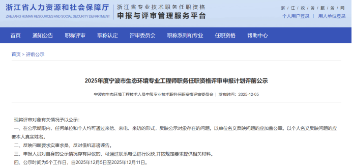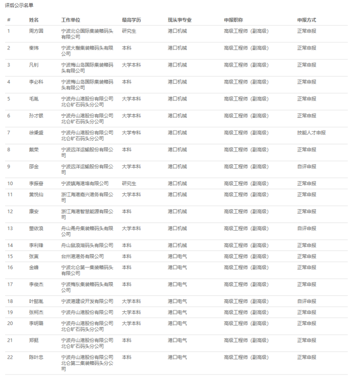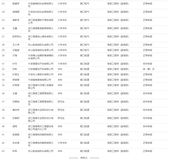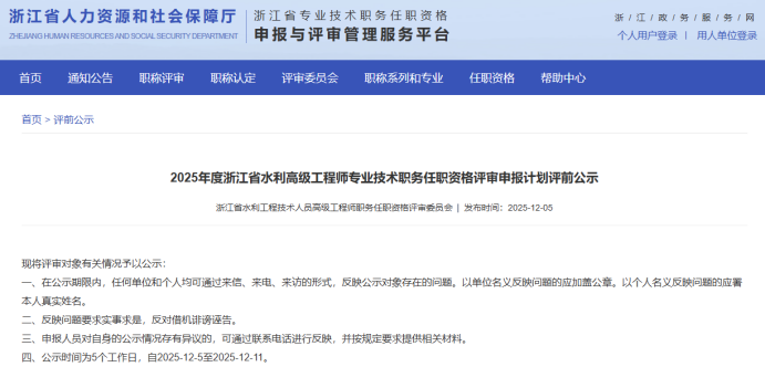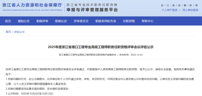 25年度浙江省港口高级评审结果发布!省水利高级、宁波市生态环境中级评前公示发布!发表时间:2025-12-05 16:29 01 25年度浙江省港口工程高级评审结果发布 12月4日,浙江省港口工程专业高级工程师职务任职资格评审委员会发布《2025年度浙江省港口工程专业高级工程师职务任职资格评审会议评后公示》,经浙江省港口工程专业高级工程师职务任职资格评审委员会评审通过,叶懿胤等43人具有高级工程师职务任职资格,现予以公示,接受社会监督。 ![]() 公示时间 2025年12月4日至12月12日; 人员名单 ![]() ![]() 02 25年度浙江省水利高级评前公示发布 12月5日,浙江省水利工程技术人员高级工程师职务任职资格评审委员会发布《2025年度浙江省水利高级工程师专业技术职务任职资格评审申报计划评前公示》,本次共有455人进入评前公示,顺利通过公示期后,就将送至专家评委会进行专业评审。 ![]() 公示时间 公示时间为5个工作日,自2025-12-5至2025-12-11。 人员名单 ![]() ![]() 03 25年度宁波市生态环境中级评前公示发布 12月5日,宁波市生态环境工程技术人员中级专业技术职务任职资格评审委员会发布《2025年度宁波市生态环境专业工程师职务任职资格评审申报计划评前公示》,本次共有112人进入评前公示,顺利通过公示期后,就将送至专家评委会进行专业评审。 ![]() 公示时间 公示时间为5个工作日,自2025年12月5日至2025年12月11日。 人员名单 ![]() |