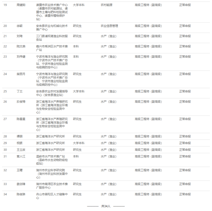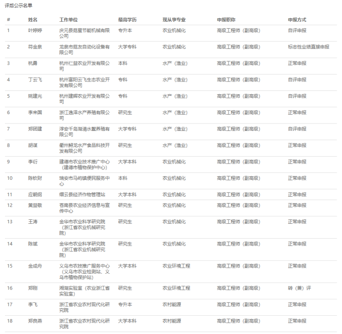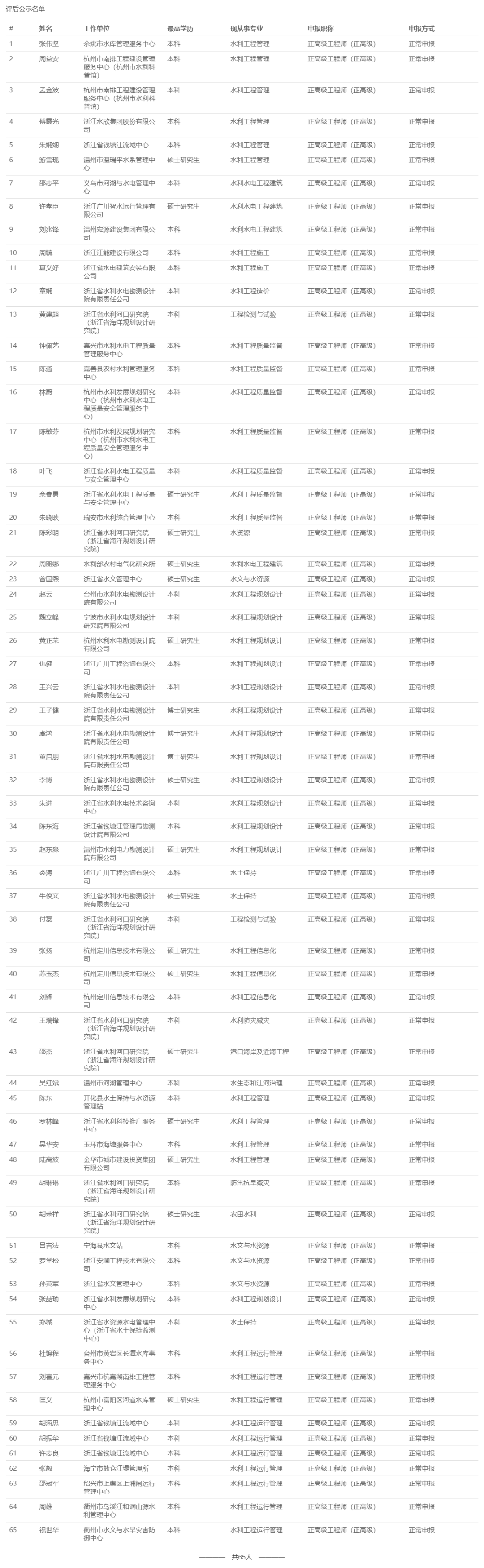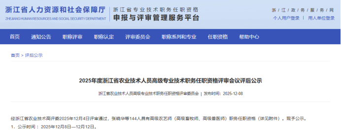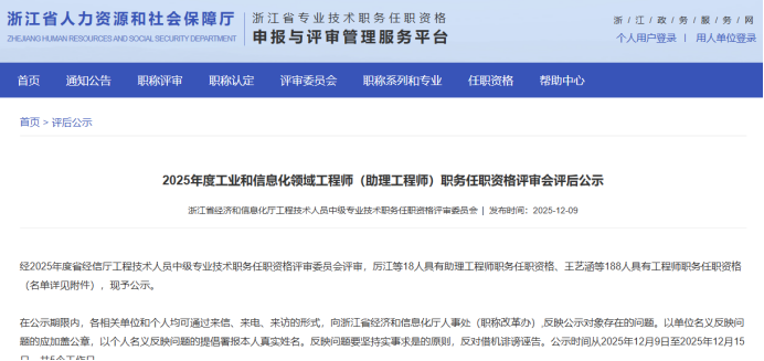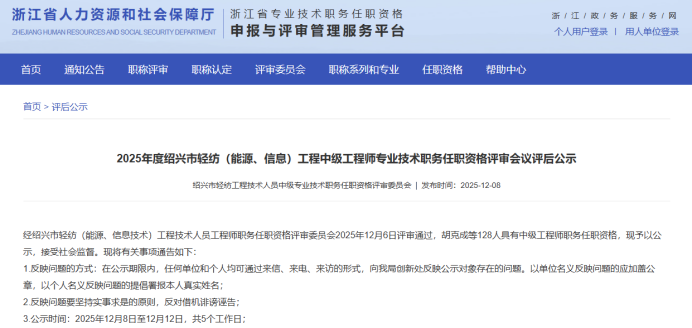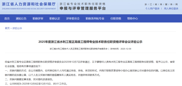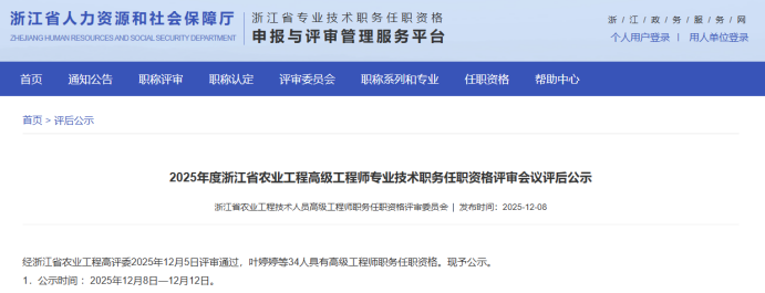 【评审结果】25年度省水利正高级、农业高级、省经信厅中初级、绍兴轻纺能源信息中级评审结果发布!发表时间:2025-12-09 16:17 01 25年度浙江省经信厅中初级职称评审结果发布 12月9日,浙江省经济和信息化厅工程技术人员中级专业技术职务任职资格评审委员会发布《2025年度工业和信息化领域工程师(助理工程师)职务任职资格评审会评后公示》,经2025年度省经信厅工程技术人员中级专业技术职务任职资格评审委员会评审,厉江等18人具有助理工程师职务任职资格、王艺涵等188人具有工程师职务任职资格,现予公示。 ![]() 公示时间 公示时间从2025年12月9日至2025年12月15日,共5个工作日。 人员名单 ![]() 02 25年度浙江省水利正高级职称评审结果发布 12月9日,浙江省水利工程技术人员正高级工程师职务任职资格评审委员会发布《2025年度浙江省水利工程正高级工程师专业技术职务任职资格评审会议评后公示》,经省水利工程专业正高级工程师职务任职资格评审委员会2025年12月7日评审通过,王子健等65人具有水利工程专业正高级工程师职务任职资格,现予以公示,接受社会监督。 ![]() 公示时间 公示时间为 2025年12月9日至12月15日,共5个工作日。 人员名单 ![]() 03 25年度浙江省农业工程高级职称评审结果发布 12月8日,浙江省农业工程技术人员高级工程师职务任职资格评审委员会发布《2025年度浙江省农业工程高级工程师专业技术职务任职资格评审会议评后公示》,经浙江省农业工程高评委2025年12月5日评审通过,叶婷婷等34人具有高级工程师职务任职资格。现予公示。 ![]() 公示时间 2025年12月8日—12月12日。 人员名单 ![]() ![]() 04 25年度浙江省农业技术高级职称评审结果发布 12月8日,浙江省农业技术人员高级专业技术职务任职资格评审委员会发布《2025年度浙江省农业技术人员高级专业技术职务任职资格评审会议评后公示》,经浙江省农业技术高评委2025年12月4日评审通过,张晓华等144人具有高级农艺师(高级畜牧师、高级兽医师)职务任职资格。现予公示。 ![]() 公示时间 2025年12月8日—12月12日。 人员名单 ![]() 05 25年度绍兴市轻纺(能源、信息)中级职称评审结果发布 12月8日,绍兴市轻纺工程技术人员中级专业技术职务任职资格评审委员会发布《2025年度绍兴市轻纺(能源、信息)工程中级工程师专业技术职务任职资格评审会议评后公示》,经绍兴市轻纺(能源、信息技术)工程技术人员工程师职务任职资格评审委员会2025年12月6日评审通过,胡克成等128人具有中级工程师职务任职资格,现予以公示,接受社会监督。 ![]() 公示时间 2025年12月8日至12月12日,共5个工作日。 人员名单 ![]() |
