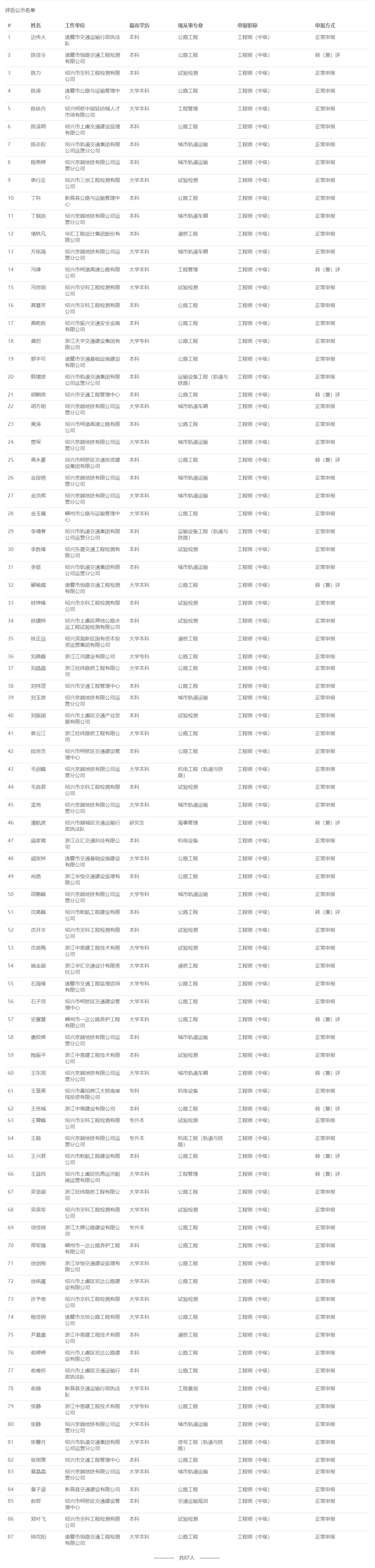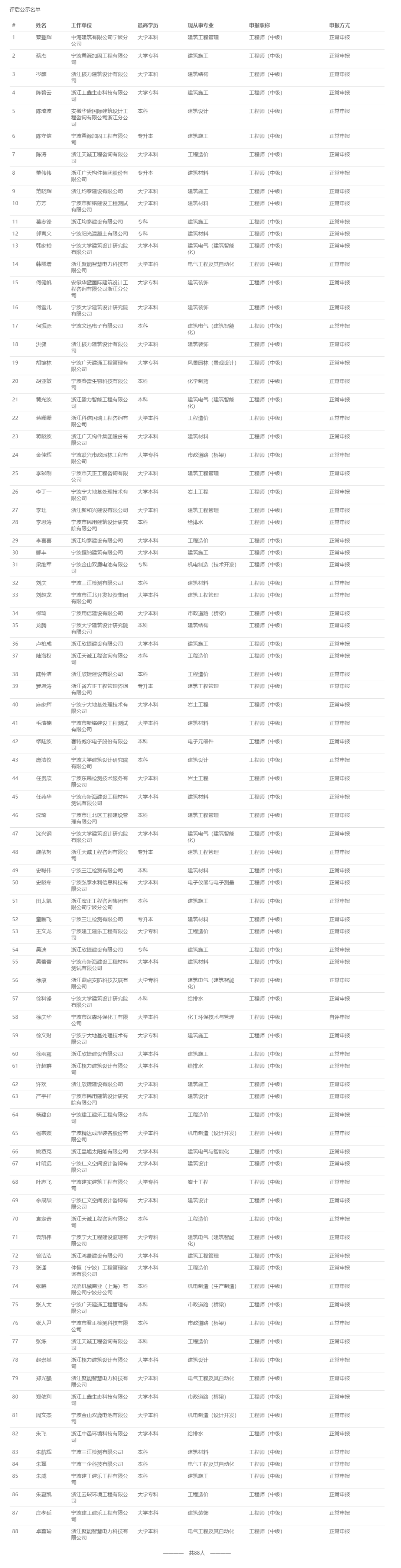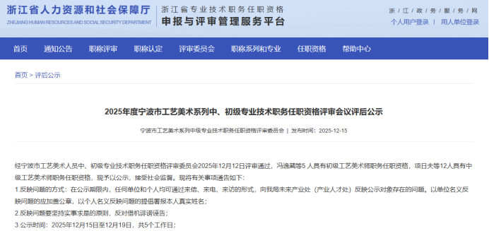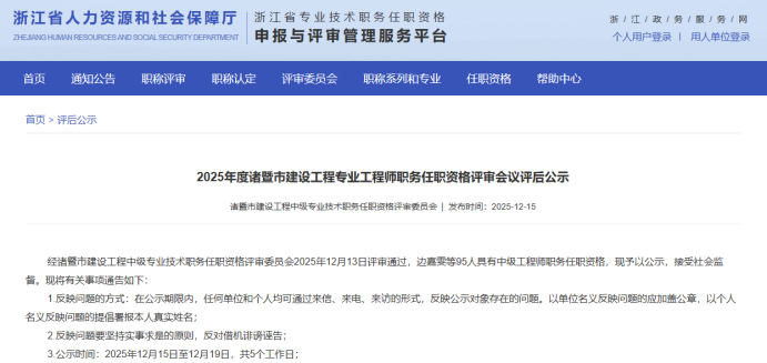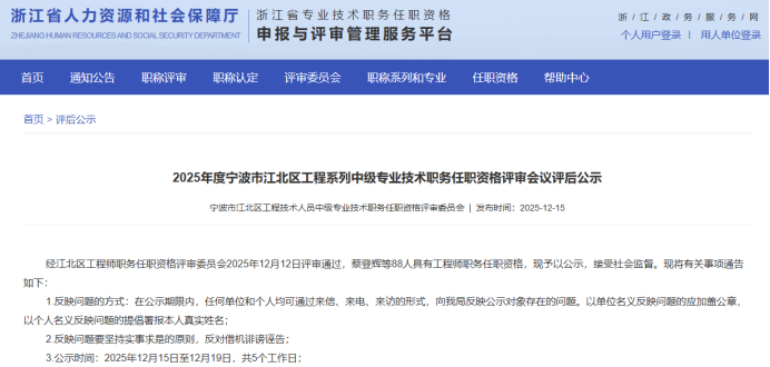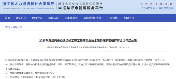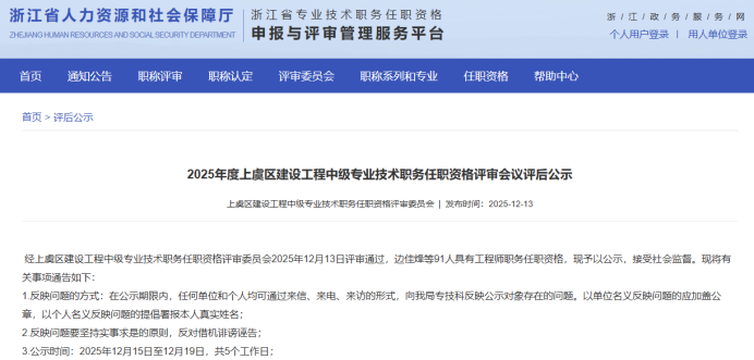 【评审结果】25年度宁波工艺美术中初级、江北工程中级,绍兴市交通中级,诸暨、上虞建筑中级,嵊州机电中级评审结果发布!发表时间:2025-12-15 16:26 01 25年度宁波市江北区工程系列中级评审结果发布 12月15日,宁波市江北区工程技术人员中级专业技术职务任职资格评审委员会发布《2025年度宁波市江北区工程系列中级专业技术职务任职资格评审会议评后公示》,经江北区工程师职务任职资格评审委员会2025年12月12日评审通过,蔡登辉等88人具有工程师职务任职资格,现予以公示,接受社会监督。 ![]() 公示时间 2025年12月15日至12月19日,共5个工作日; 人员名单 ![]() 02 25年度宁波市工艺美术系列中、初级评审结果发布 12月15日,宁波市工艺美术系列中级专业技术职务任职资格评审委员会发布《2025年度宁波市工艺美术系列中、初级专业技术职务任职资格评审会议评后公示》,经宁波市工艺美术人员中、初级专业技术职务任职资格评审委员会2025年12月12日评审通过,冯逸葳等5 人具有初级工艺美术师职务任职资格,项日夫等12人具有中级工艺美术师职务任职资格,现予以公示,接受社会监督。 ![]() 公示时间 2025年12月15日至12月19日,共5个工作日; 人员名单 ![]() 03 25年度绍兴交通中级评审结果发布 12月15日,绍兴市交通运输工程技术人员中级专业技术职务任职资格评审委员会发布《2025年度绍兴市交通运输工程工程师专业技术职务任职资格评审会议评后公示》,经绍兴市交通运输工程(含轨道交通)中级专业技术资格评审委员会2025年12月13日评审通过,丁科等87人具有工程师职务任职资格,现予公示。 ![]() 公示时间 2025年12月15日至12月22日,共5个工作日; 人员名单 ![]() 04 25年度诸暨市建筑中级评审结果发布 12月15日,诸暨市建设工程中级专业技术职务任职资格评审委员会发布《2025年度诸暨市建设工程专业工程师职务任职资格评审会议评后公示》,经诸暨市建设工程中级专业技术职务任职资格评审委员会2025年12月13日评审通过,边嘉雯等95人具有中级工程师职务任职资格,现予以公示,接受社会监督。 ![]() 公示时间 2025年12月15日至12月19日,共5个工作日; 人员名单 ![]() 05 25年度上虞区建筑中级评审结果发布 12月13日,上虞区建设工程中级专业技术职务任职资格评审委员会发布《2025年度上虞区建设工程中级专业技术职务任职资格评审会议评后公示》,经上虞区建设工程中级专业技术职务任职资格评审委员会2025年12月13日评审通过,边佳烽等91人具有工程师职务任职资格,现予以公示,接受社会监督。 ![]() 公示时间 2025年12月15日至12月19日,共5个工作日; 人员名单 ![]() 06 25年度嵊州市机电中级评审结果发布 12月13日,嵊州市机电工程技术人员中级专业技术职务任职资格评审委员会发布《2025年度嵊州市机电工程技术专业中级专业技术职务任职资格评审会议评后公示》,经嵊州市机电工程技术人员中级专业技术职务任职资格评审委员会2025年12月13日评审通过,成永等30人具有中级工程师职务任职资格,现予以公示,接受社会监督。 ![]() 公示时间 2025年12月13日至12月19日,共5个工作日; 人员名单 ![]() ![]() |