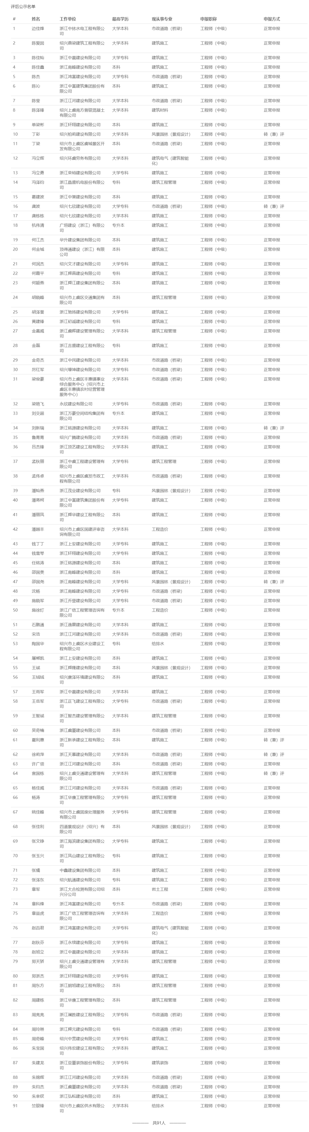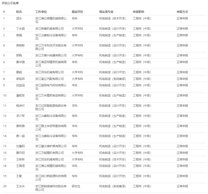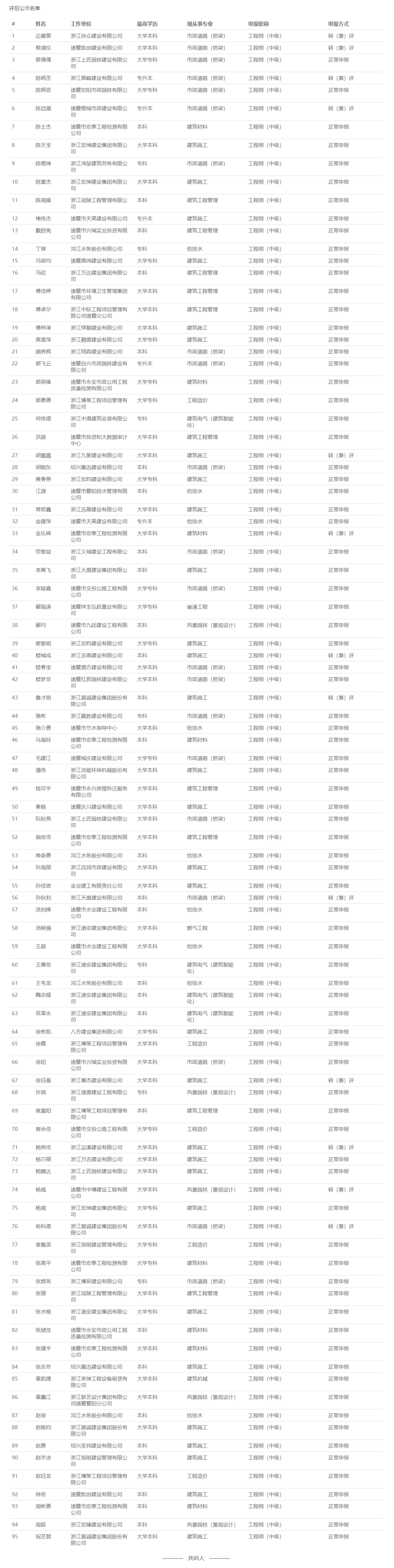 【评审结果】25年度宁波工艺美术中初级、江北工程中级,绍兴市交通中级,诸暨、上虞建筑中级,嵊州机电中级评审结果发布!发表时间:2025-12-15 16:26 01 25年度宁波市江北区工程系列中级评审结果发布 12月15日,宁波市江北区工程技术人员中级专业技术职务任职资格评审委员会发布《2025年度宁波市江北区工程系列中级专业技术职务任职资格评审会议评后公示》,经江北区工程师职务任职资格评审委员会2025年12月12日评审通过,蔡登辉等88人具有工程师职务任职资格,现予以公示,接受社会监督。 ![]() 公示时间 2025年12月15日至12月19日,共5个工作日; 人员名单 ![]() 02 25年度宁波市工艺美术系列中、初级评审结果发布 12月15日,宁波市工艺美术系列中级专业技术职务任职资格评审委员会发布《2025年度宁波市工艺美术系列中、初级专业技术职务任职资格评审会议评后公示》,经宁波市工艺美术人员中、初级专业技术职务任职资格评审委员会2025年12月12日评审通过,冯逸葳等5 人具有初级工艺美术师职务任职资格,项日夫等12人具有中级工艺美术师职务任职资格,现予以公示,接受社会监督。 ![]() 公示时间 2025年12月15日至12月19日,共5个工作日; 人员名单 ![]() 03 25年度绍兴交通中级评审结果发布 12月15日,绍兴市交通运输工程技术人员中级专业技术职务任职资格评审委员会发布《2025年度绍兴市交通运输工程工程师专业技术职务任职资格评审会议评后公示》,经绍兴市交通运输工程(含轨道交通)中级专业技术资格评审委员会2025年12月13日评审通过,丁科等87人具有工程师职务任职资格,现予公示。 ![]() 公示时间 2025年12月15日至12月22日,共5个工作日; 人员名单 ![]() 04 25年度诸暨市建筑中级评审结果发布 12月15日,诸暨市建设工程中级专业技术职务任职资格评审委员会发布《2025年度诸暨市建设工程专业工程师职务任职资格评审会议评后公示》,经诸暨市建设工程中级专业技术职务任职资格评审委员会2025年12月13日评审通过,边嘉雯等95人具有中级工程师职务任职资格,现予以公示,接受社会监督。 ![]() 公示时间 2025年12月15日至12月19日,共5个工作日; 人员名单 ![]() 05 25年度上虞区建筑中级评审结果发布 12月13日,上虞区建设工程中级专业技术职务任职资格评审委员会发布《2025年度上虞区建设工程中级专业技术职务任职资格评审会议评后公示》,经上虞区建设工程中级专业技术职务任职资格评审委员会2025年12月13日评审通过,边佳烽等91人具有工程师职务任职资格,现予以公示,接受社会监督。 ![]() 公示时间 2025年12月15日至12月19日,共5个工作日; 人员名单 ![]() 06 25年度嵊州市机电中级评审结果发布 12月13日,嵊州市机电工程技术人员中级专业技术职务任职资格评审委员会发布《2025年度嵊州市机电工程技术专业中级专业技术职务任职资格评审会议评后公示》,经嵊州市机电工程技术人员中级专业技术职务任职资格评审委员会2025年12月13日评审通过,成永等30人具有中级工程师职务任职资格,现予以公示,接受社会监督。 ![]() 公示时间 2025年12月13日至12月19日,共5个工作日; 人员名单 ![]() ![]() |