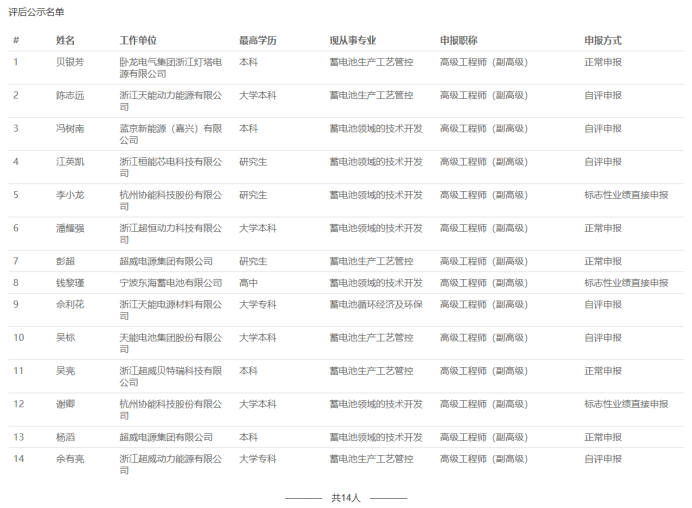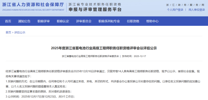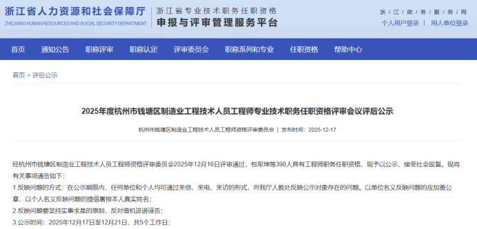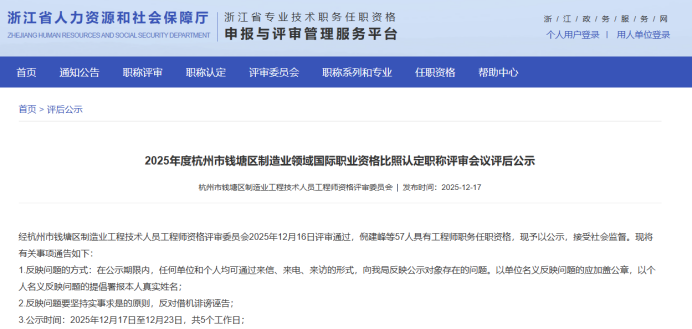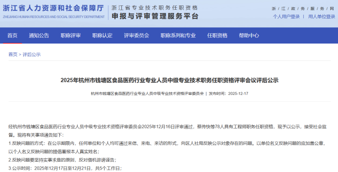 【评审结果】25年度浙江省蓄电池行业高级,钱塘区制造业中级、食品医药中级评审结果发布!发表时间:2025-12-17 15:47 01 25年度浙江省蓄电池行业高级评审结果发布 12月17日,浙江省蓄电池行业高级工程师职务任职资格评审委员会 发布《2025年度浙江省蓄电池行业高级工程师职务任职资格评审会议评后公示》,经浙江省蓄电池行业高级工程师职务任职资格评审委员会2025年12月16日评审通过,贝银芳等14人具有高级工程师职务任职资格,现予以公示,接受社会监督。 ![]() 公示时间 2025年12月17日至12月23日,共5个工作日; 人员名单 ![]() 02 25年度杭州市钱塘区制造业中级评审结果发布 12月17日,杭州市钱塘区制造业工程技术人员工程师资格评审委员会发布《2025年度杭州市钱塘区制造业工程技术人员工程师专业技术职务任职资格评审会议评后公示》,经杭州市钱塘区制造业工程技术人员工程师资格评审委员会2025年12月16日评审通过,包军坤等398人具有工程师职务任职资格,现予以公示,接受社会监督。 ![]() 公示时间 2025年12月17日至12月21日,共5个工作日; 人员名单 ![]() 03 25年度杭州市钱塘区食品医药行业中级评审结果发布 12月17日,杭州市钱塘区食品医药行业专业人员中级专业技术资格评审委员会发布《2025年杭州市钱塘区食品医药行业专业人员中级专业技术职务任职资格评审会议评后公示》,经杭州市钱塘区食品医药行业专业人员中级专业技术资格评审委员会2025年12月16日评审通过,蔡传快等78人具有工程师职务任职资格,现予以公示,接受社会监督。 ![]() 公示时间 2025年12月17日至12月21日,共5个工作日; 人员名单 ![]() 04 25年度杭州市钱塘区制造业领域国际比照认定评审结果发布 12月17日,杭州市钱塘区制造业工程技术人员工程师资格评审委员会发布《2025年度杭州市钱塘区制造业领域国际职业资格比照认定职称评审会议评后公示》,经杭州市钱塘区制造业工程技术人员工程师资格评审委员会2025年12月16日评审通过,倪建峰等57人具有工程师职务任职资格,现予以公示,接受社会监督。 ![]() 公示时间 2025年12月17日至12月23日,共5个工作日; 人员名单 ![]() |