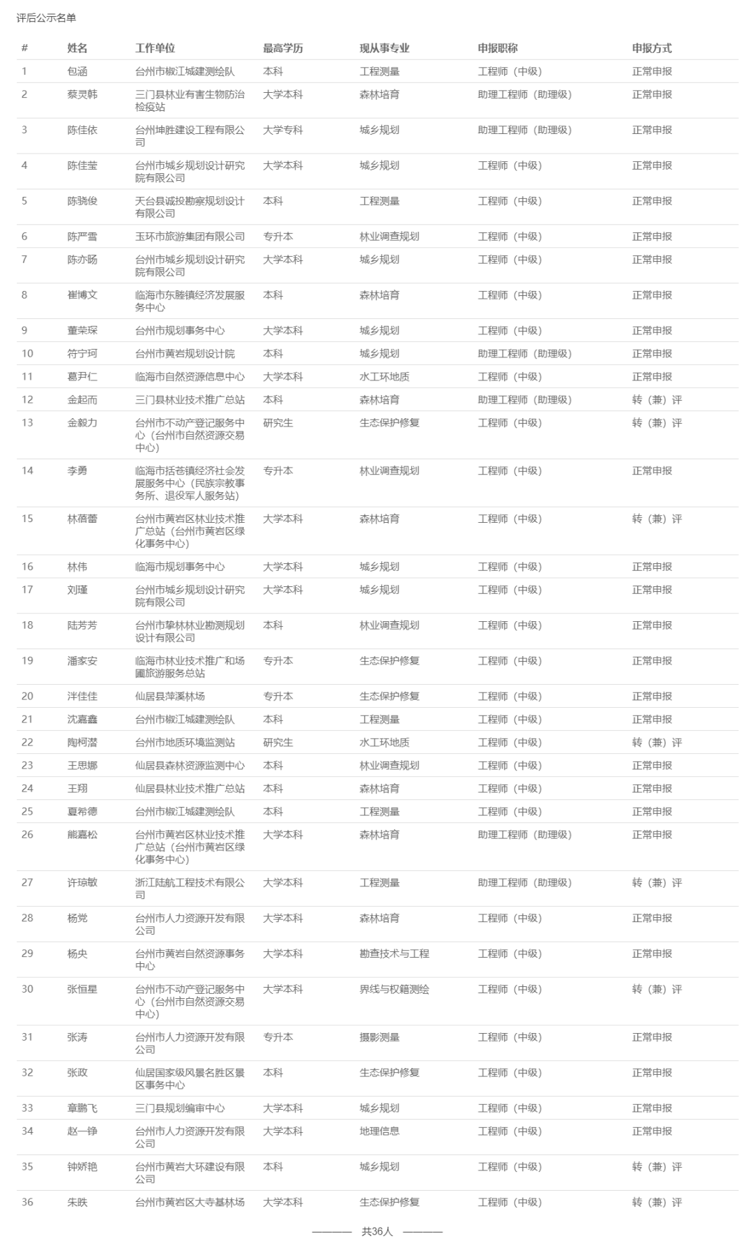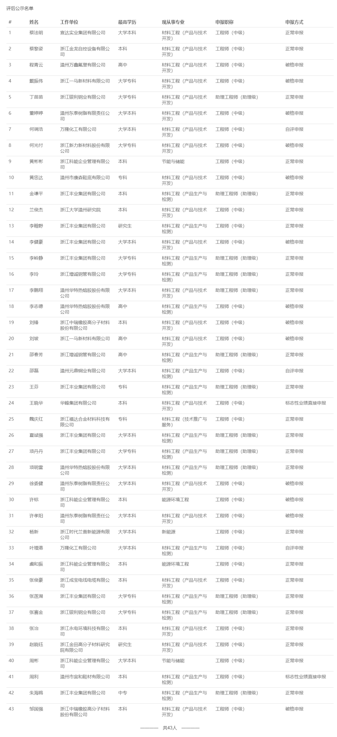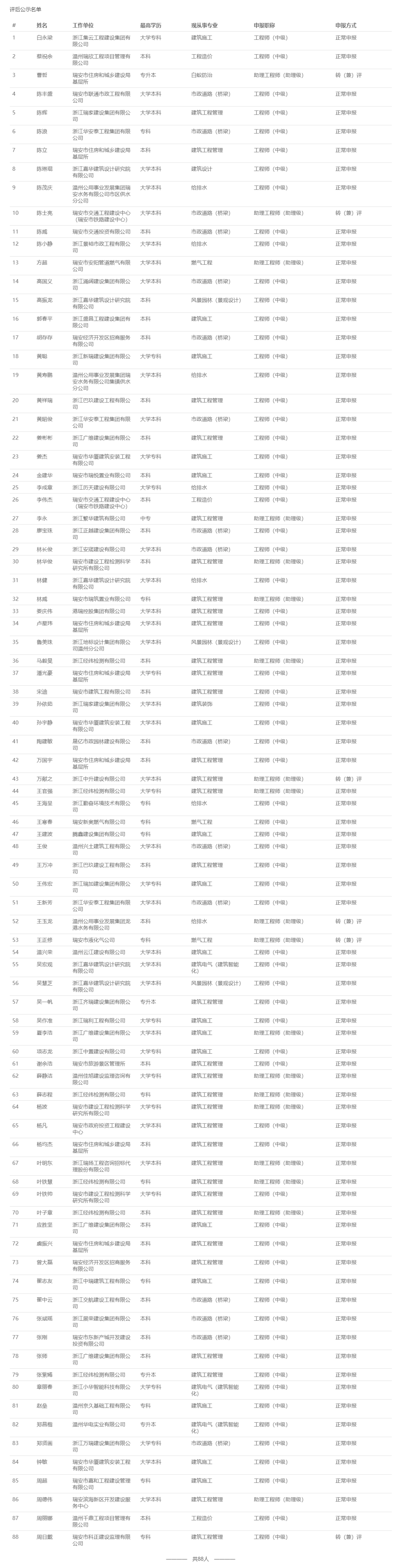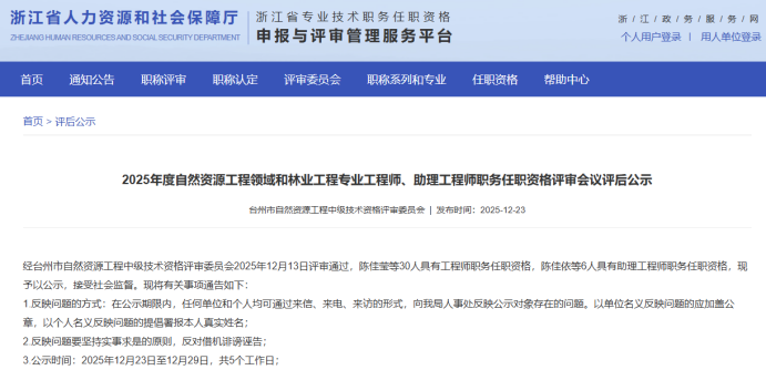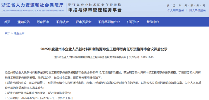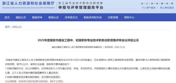 【评审结果】25年度温州市新材料和新能源中级、瑞安建筑中初级、台州自然资源和林业中初级评审结果发布!发表时间:2025-12-23 15:53 01 25年度温州市企业人员新材料和新能源中级评审结果发布 12月23日,温州市企业人员新材料和新能源专业工程师职务任职资格评审委员会发布《2025年度温州市企业人员新材料和新能源专业工程师职务任职资格评审会议评后公示》,经温州市企业人员新材料和新能源专业工程师职务任职资格评审委员会2025年12月23日评审通过,蔡法明等30人具有中级工程师职务任职资格,丁苗苗等13人具有助理工程师职务任职资格,现予以公示,接受社会监督。 ![]() 公示时间 2025年12月23日至12月27日,共5个工作日; 人员名单 ![]() 02 25年度瑞安市建设工程中初级评审结果发布 12月23日,瑞安市建设工程技术人员工程师职务任职资格评审委员会发布《2025年度瑞安市建设工程中、初级职称专业技术职务任职资格评审会议评后公示》, 经瑞安市建设工程技术人员工程师职务任职资格评审委员会2025年12月21日评审通过,白永梁等69人具有工程师职务任职资格,夏李浩等19人具有助理工程师职务任职资格,现予以公示,接受社会监督。 ![]() 公示时间 2025年12月23日至12月30日,共5个工作日。 人员名单 ![]() 03 25年度台州市自然资源和林业中初级评审结果发布 12月23日,台州市自然资源工程中级技术资格评审委员会发布《2025年度自然资源工程领域和林业工程专业工程师、助理工程师职务任职资格评审会议评后公示》,经台州市自然资源工程中级技术资格评审委员会2025年12月13日评审通过,陈佳莹等30人具有工程师职务任职资格,陈佳依等6人具有助理工程师职务任职资格,现予以公示,接受社会监督。 ![]() 公示时间 2025年12月23日至12月29日,共5个工作日; 人员名单 ![]() |