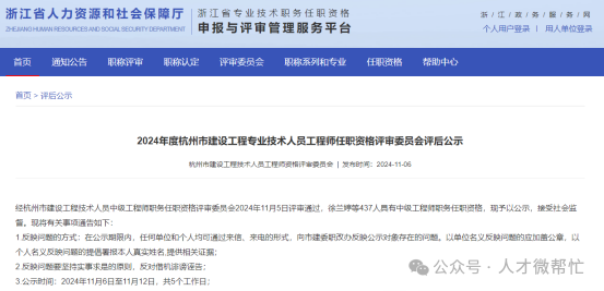 24年度杭州市(市本级)建筑中级评审结果发布!省安防评前公示发布!发表时间:2024-11-06 16:16 01 24年度杭州市建筑中级评审结果发布 11月6日,杭州市建设工程技术人员工程师资格评审委员会发布《2024年度杭州市建设工程专业技术人员工程师任职资格评审委员会评后公示》,经杭州市建设工程技术人员中级工程师职务任职资格评审委员会2024年11月5日评审通过,徐兰婷等437人具有中级工程师职务任职资格,现予以公示。