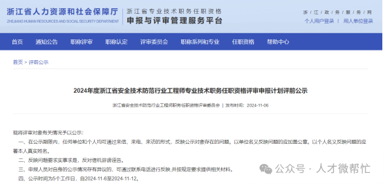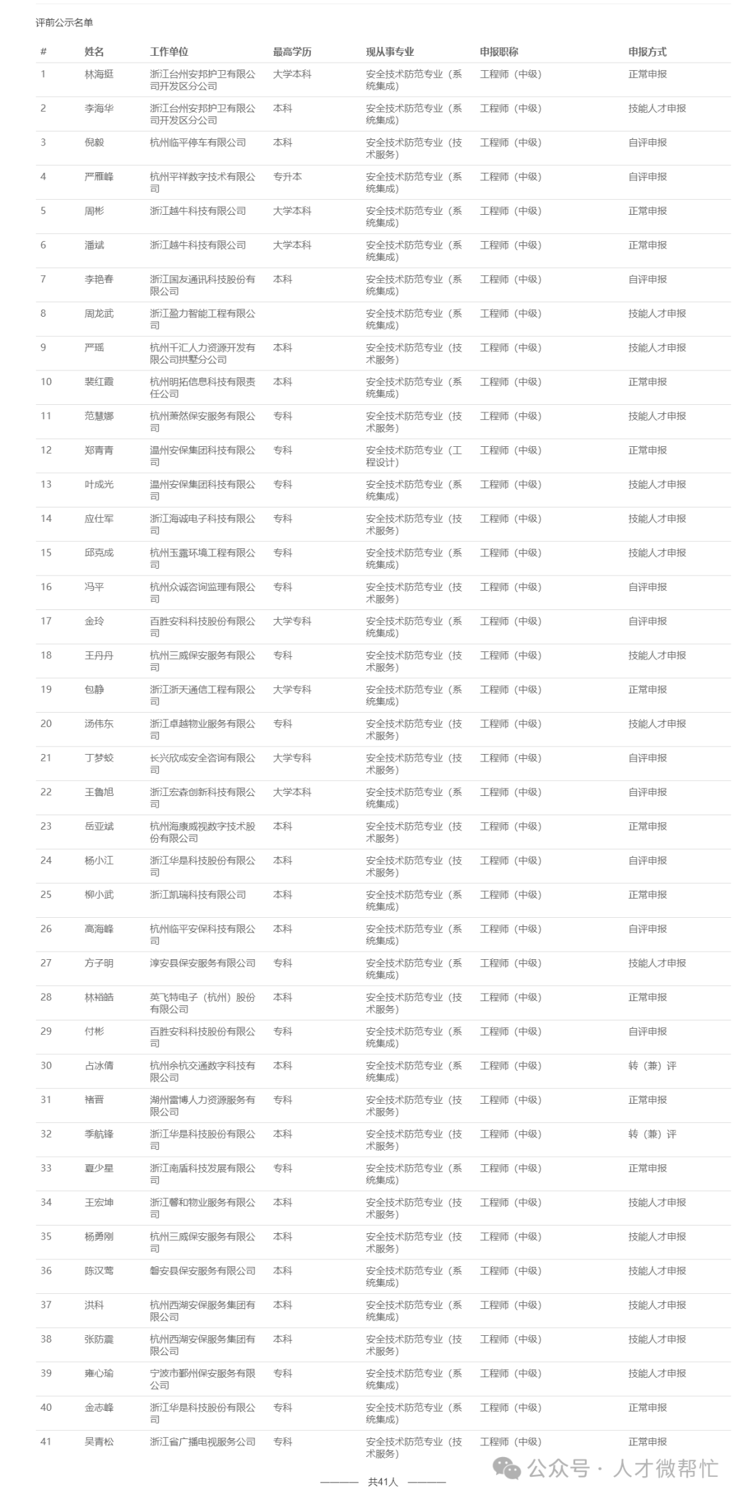 02 24年度省安防中级评前公示发布 11月6日,浙江省安全技术防范行业工程师职务任职资格评审委员会发布《2024年度浙江省安全技术防范行业工程师专业技术职务任职资格评审申报计划评前公示》,本次共有41人进入评前公示,顺利通过公示期后,就将送至专家评委会进行专业评审。