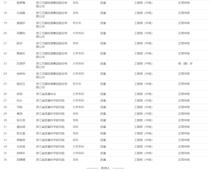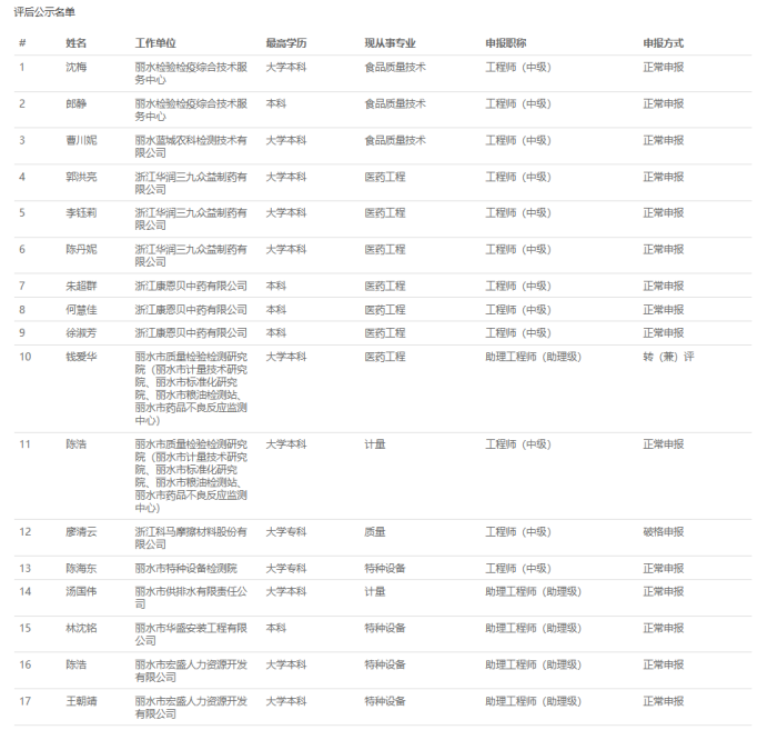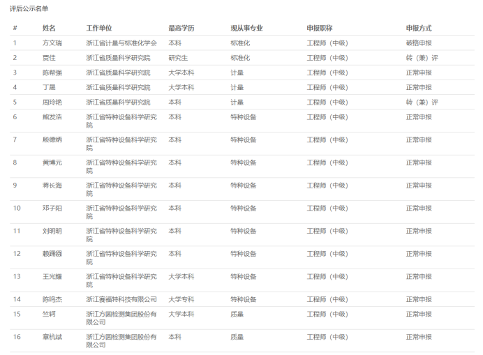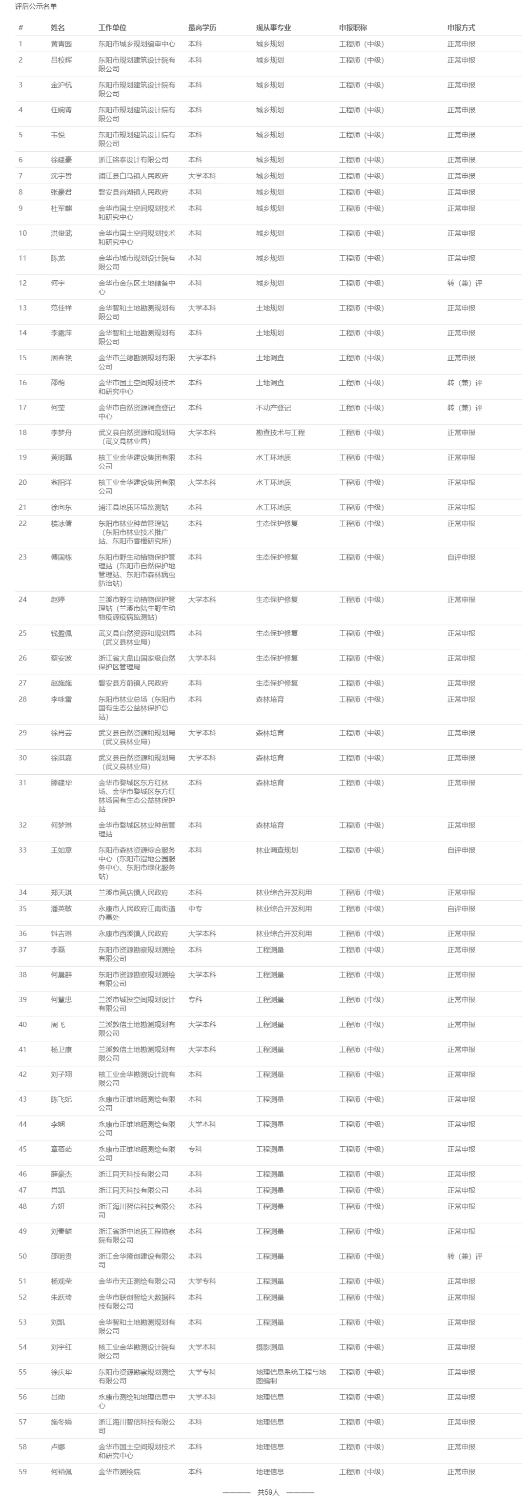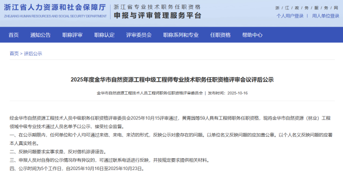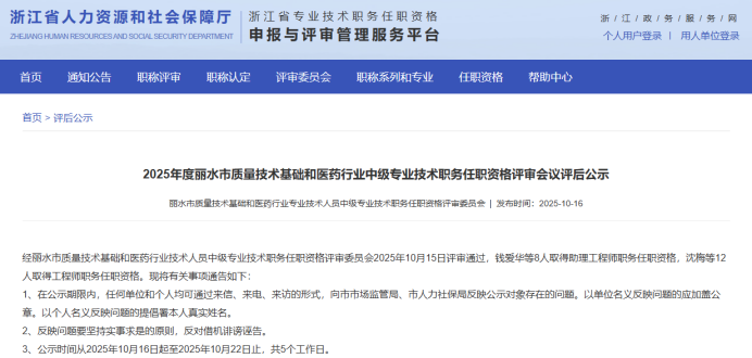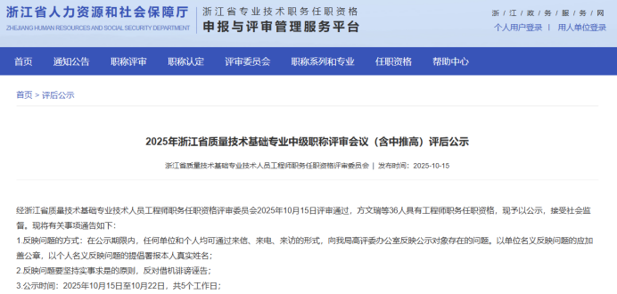 【评审结果】25年度浙江省质量中级、金华市自然资源工程中级、丽水质量和医药中级评审结果发布!发表时间:2025-10-16 16:11 01 25年度浙江省质量中级评审结果发布 10月15日,浙江省质量技术基础专业技术人员工程师职务任职资格评审委员会发布《2025年度浙江省质量技术基础专业中级职称评审会议(含中推高)评后公示》,经浙江省质量技术基础专业技术人员工程师职务任职资格评审委员会2025年10月15日评审通过,方文瑞等36人具有工程师职务任职资格,现予以公示,接受社会监督。 ![]() 公示时间 2025年10月15日至10月22日,共5个工作日; 人员名单 ![]() ![]() 02 25年度金华市自然资源工程中级评审结果发布 10月16日,金华市自然资源工程技术人员工程师职务任职资格评审委员会发布《2025年度金华市自然资源工程中级工程师专业技术职务任职资格评审会议评后公示》,经金华市自然资源工程技术人员中级职务任职资格评审委员会2025年10月15评审通过,黄青园等59人具有工程师职务任职资格,现将金华市自然资源(林业)工程领域中级专业技术通过人员名单予以公示,接受社会监督。 ![]() 公示时间 5个工作日,自2025年10月16日至2025年10月23日。 人员名单 ![]() 03 25年度丽水质量和医药中级评审结果发布 10月16日,丽水市质量技术基础和医药行业专业技术人员中级专业技术职务任职资格评审委员会发布《2025年度丽水市质量技术基础和医药行业中级专业技术职务任职资格评审会议评后公示》,经丽水市质量技术基础和医药行业技术人员中级专业技术职务任职资格评审委员会2025年10月15日评审通过,钱爱华等8人取得助理工程师职务任职资格,沈梅等12人取得工程师职务任职资格。 ![]() 公示时间 公示时间从2025年10月16日起至2025年10月22日止,共5个工作日。 人员名单 ![]() ![]() |